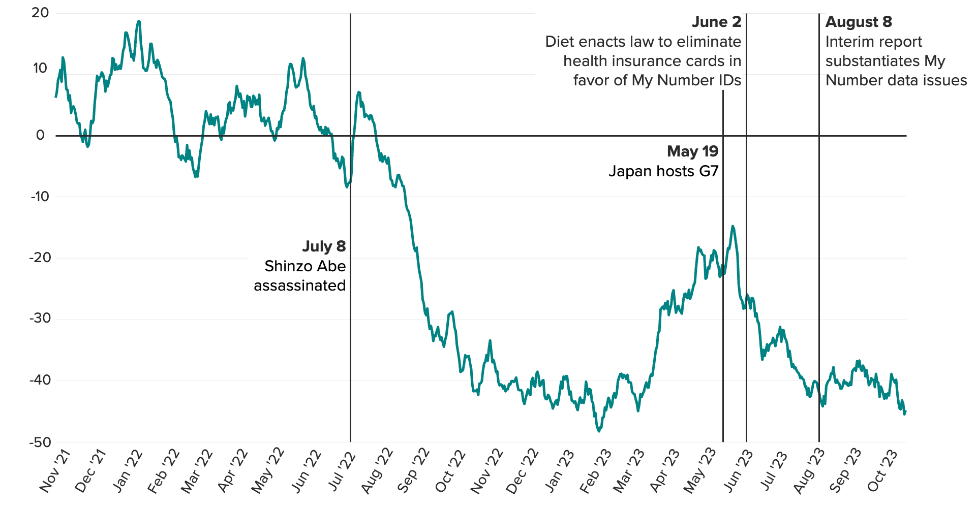 The recovery would prove short-lived: As of Oct. 15, his net approval rating had fallen 17 points in six months, and 30 points from its May apotheosis. Among other factors, we attribute the decline to the government’s early June move to eliminate health insurance cards and link Japan’s popular nationalized insurance coverage to an unpopular government ID card system known as “My Number.” An interim report found the rollout was widely botched, with thousands of registration errors and other administrative issues.