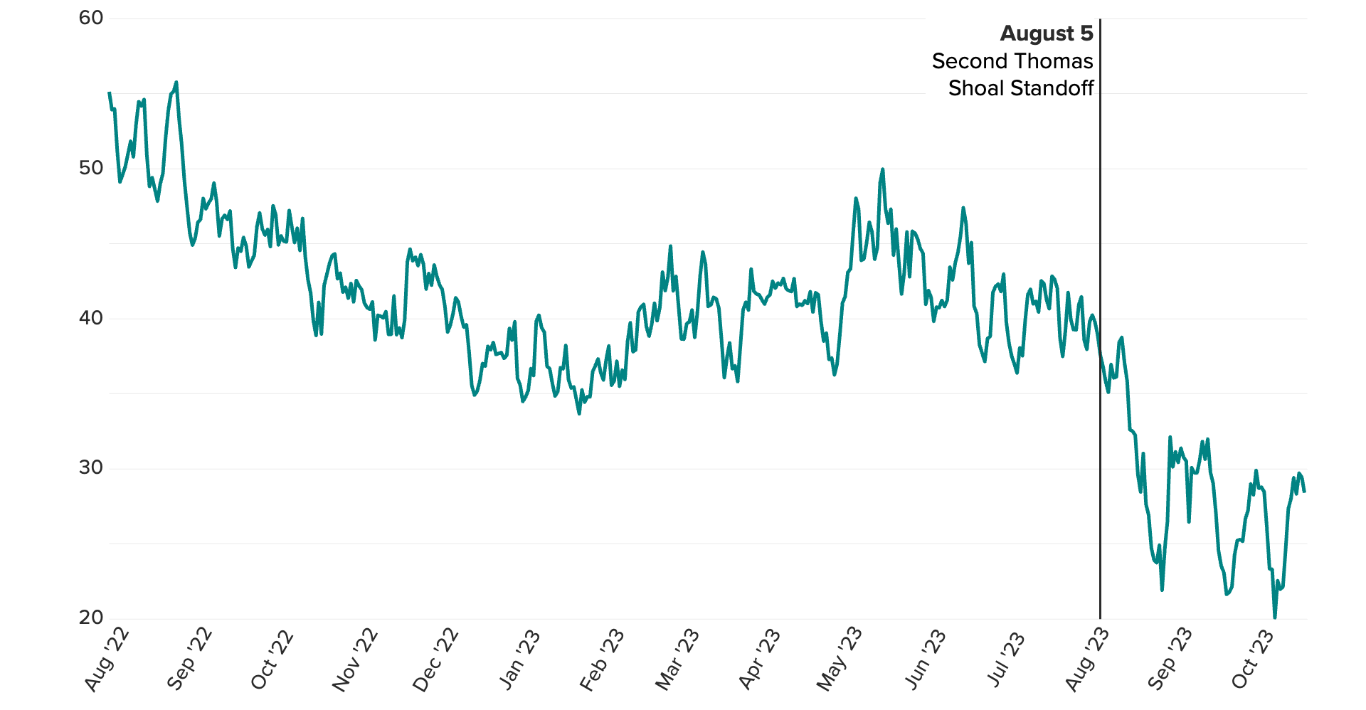 The incident touched a nerve in the Philippines, leading President Ferdinand “Bong Bong” Marcos Jr. to issue a sweeping rethink of his country’s national security strategy to refocus on naval sovereignty shortly after Manila summoned the Chinese ambassador. The move has drawn the Philippines closer to the United States but increased the likelihood of a confrontation with China, which has pursued increasingly aggressive naval actions in attempts to force the Philippines out of the area. Public sentiment has remained relatively volatile since the first incident — as seen in moderate and persistent see-sawing in our own data in recent months — suggesting the public is divided on the best path forward.