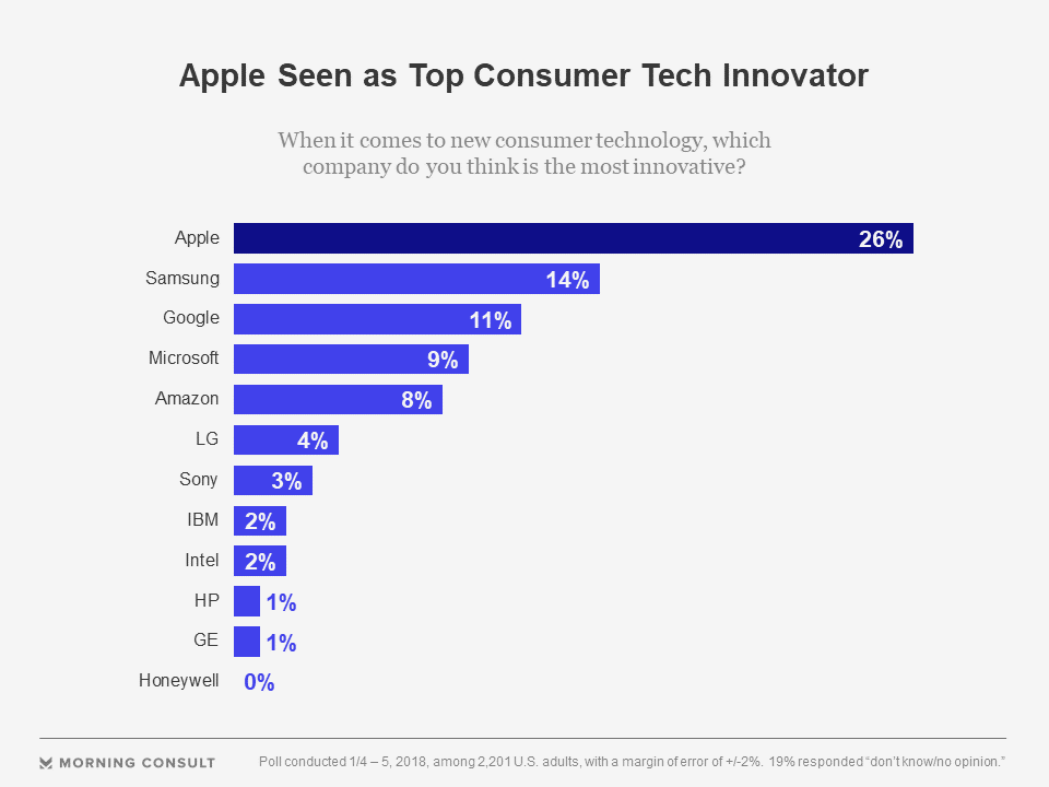 When U.S. adults were asked which consumer technology company is the most innovative, Apple Inc. was the clear winner among a list of 12 businesses, chosen by 26 percent of the 2,201 participants in a recent Morning Consult survey. Samsung Electronics Co. came in second, at 14 percent.
