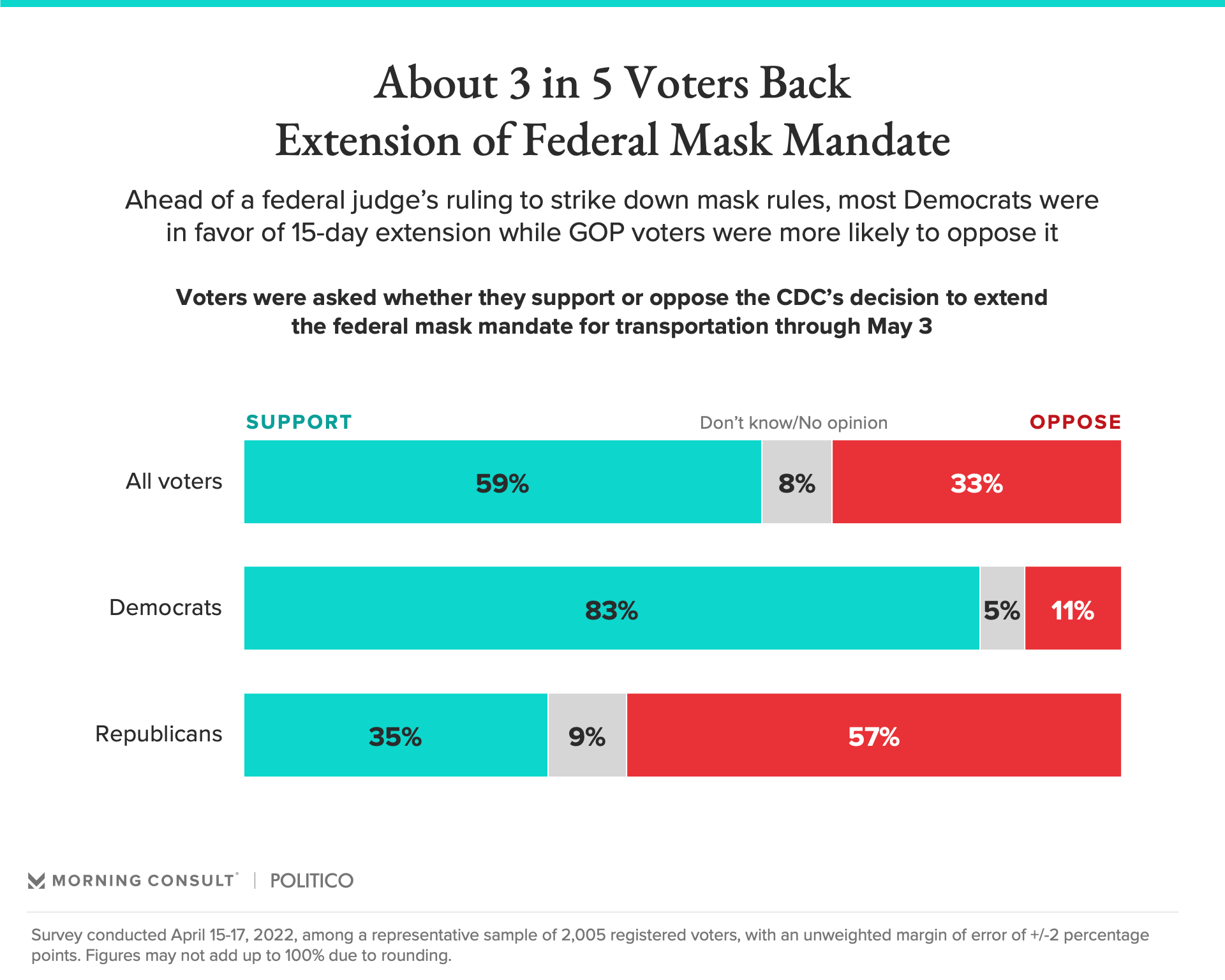 - About 3 in 5 voters said they support the Centers for Disease Control and Prevention’s decision last week to extend the federal mask mandate for transit hubs through May 3, but a federal judge in Florida struck it down Monday, prompting several airlines and ride-sharing apps to lift their mask mandates. One in 3 voters opposed the CDC’s move.
