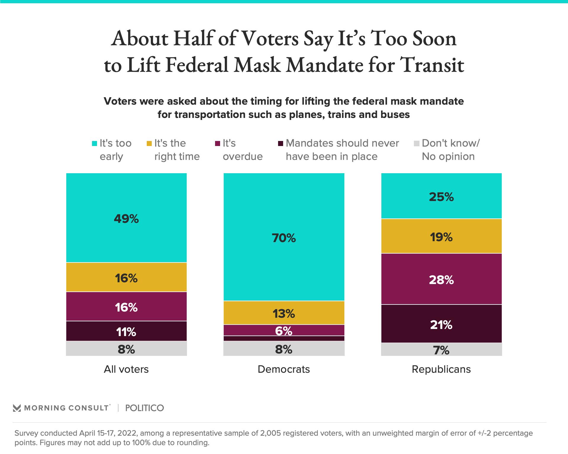 - Voters had a range of opinions on when mask requirements on public transportation should be lifted. About half of voters said it’s still too early, while 16% said it’s the right time and the same share said it’s overdue. About 1 in 10, meanwhile, said the requirement never should’ve existed in the first place.
