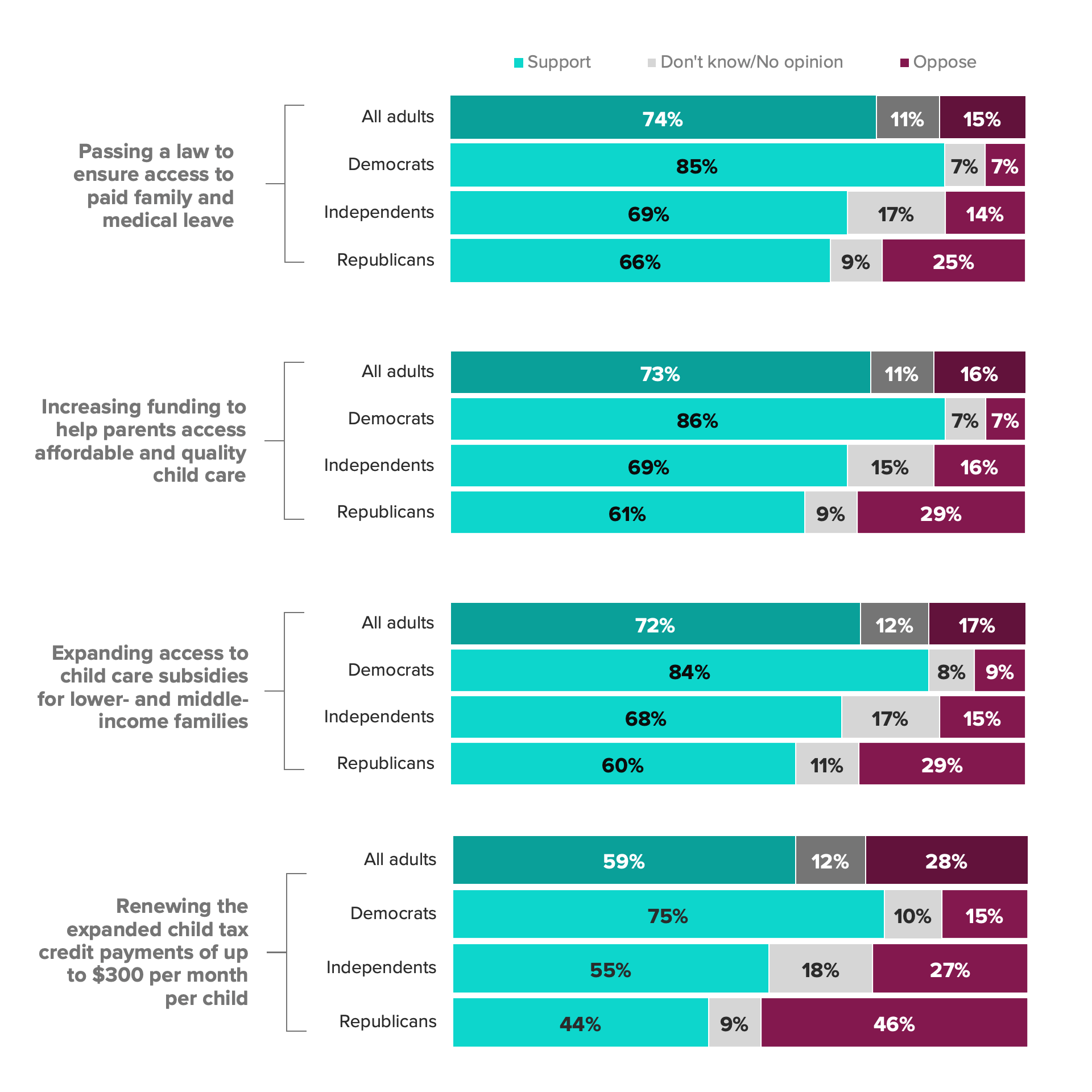 As Senate Democrats move on reconciliation bill sans child care, family leave provisions, nearly 3 in 4 U.S. adults say they support such policies
