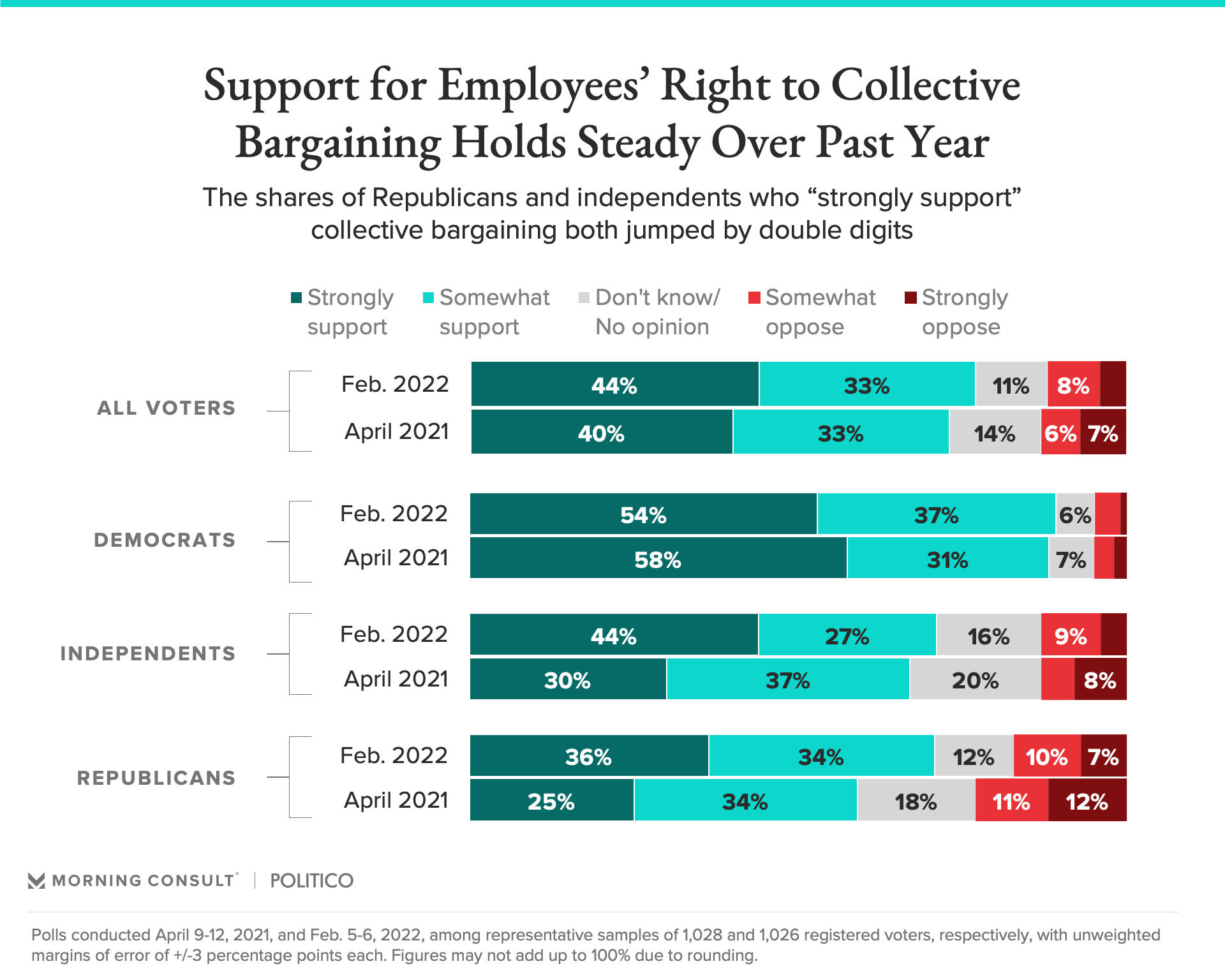 - “Strong” support for collective bargaining among Republicans and independents, meanwhile, saw increases outside the groups’ margin of error, with 11- and 14-percentage-point bumps, respectively.