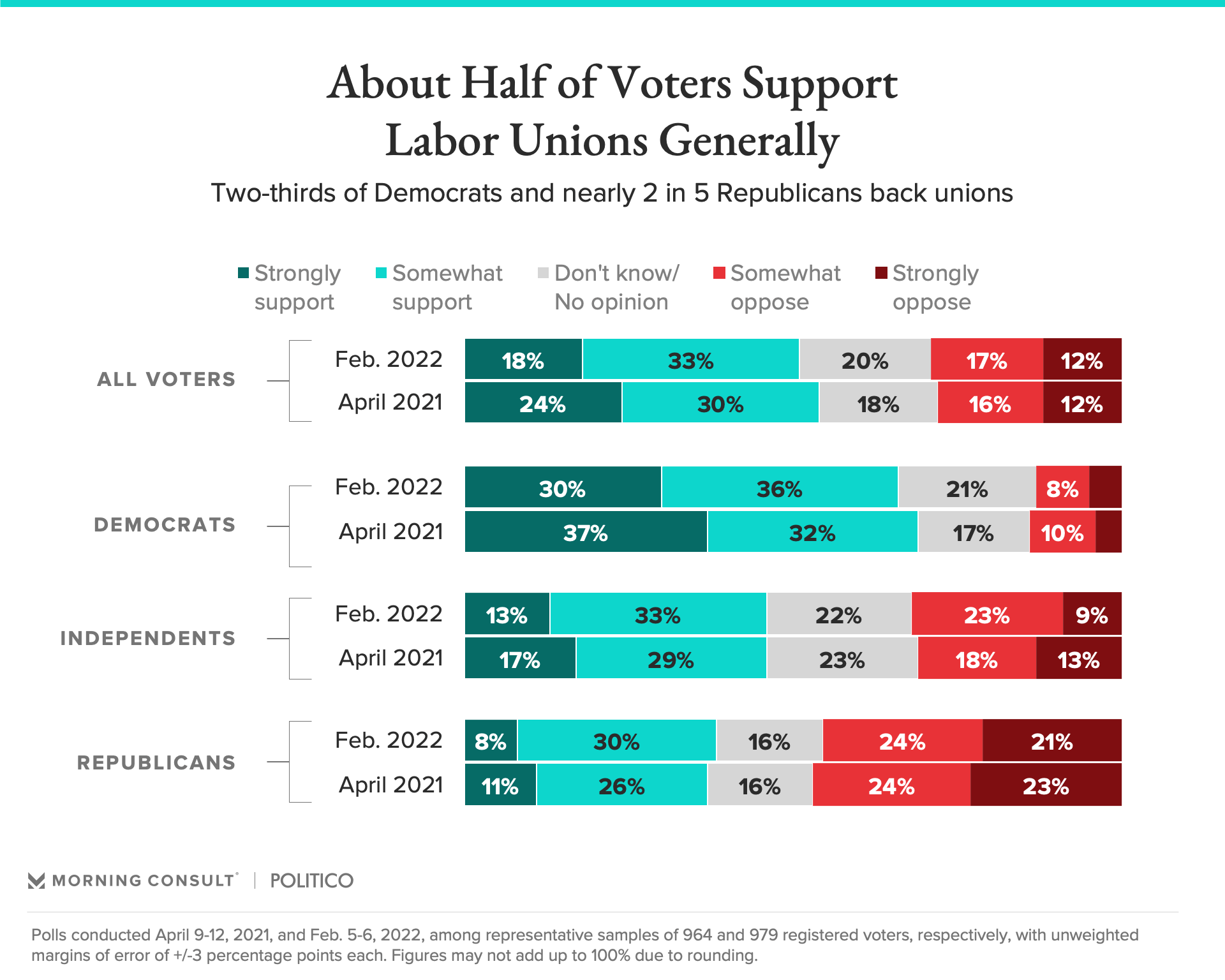 - In the survey, nearly half of the respondents were asked whether they backed workers’ “right to bargain collectively” for various workplace protections, while the other half were asked simply about their support for “labor unions.” Voter support was substantially higher for the former, and also in line with the results from an April 2021 Morning Consult/Politico poll.