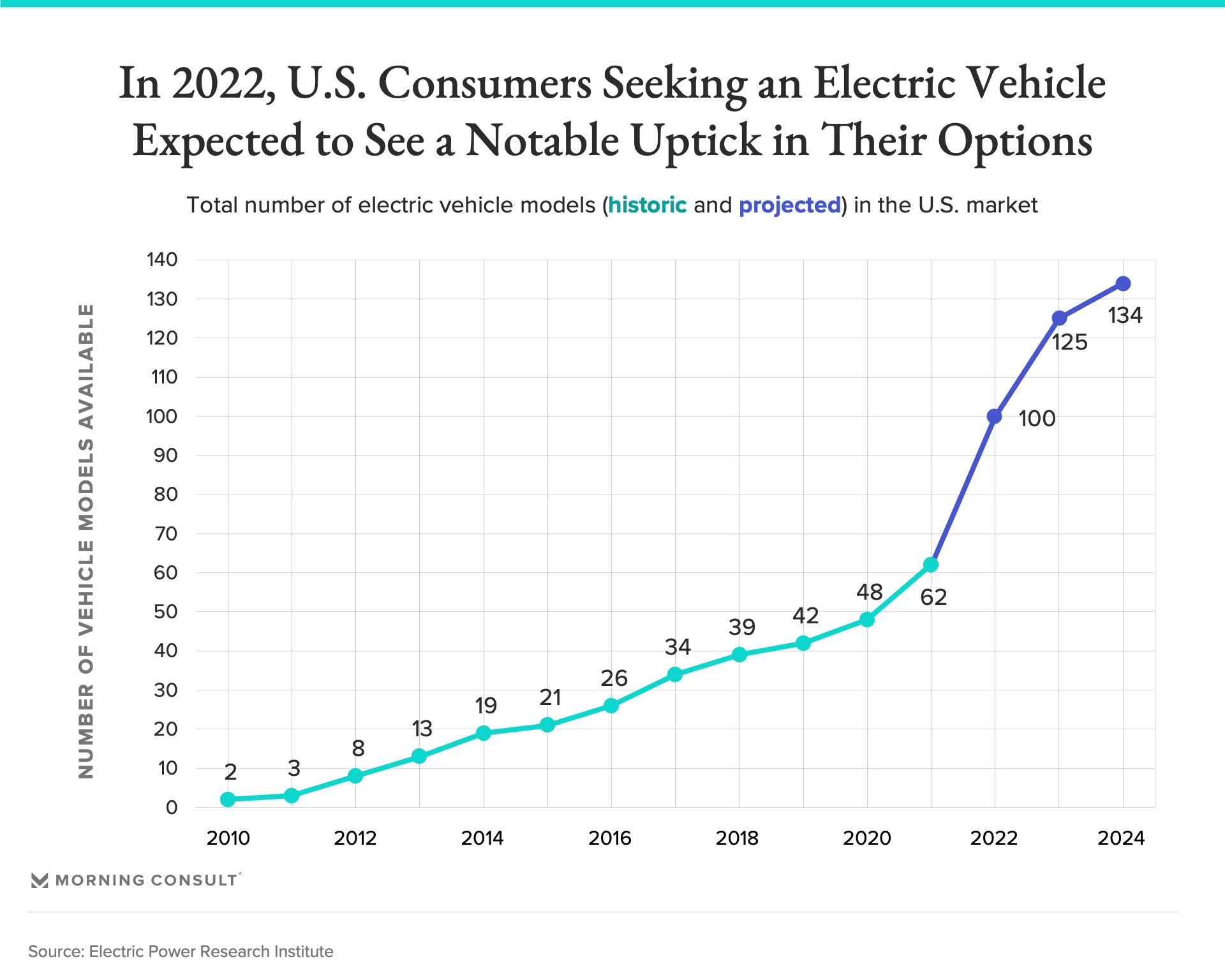 2022 is expected to bring an especially dramatic increase in the number of EVs on the U.S. market: from the roughly 62 models available at present to at least 100.