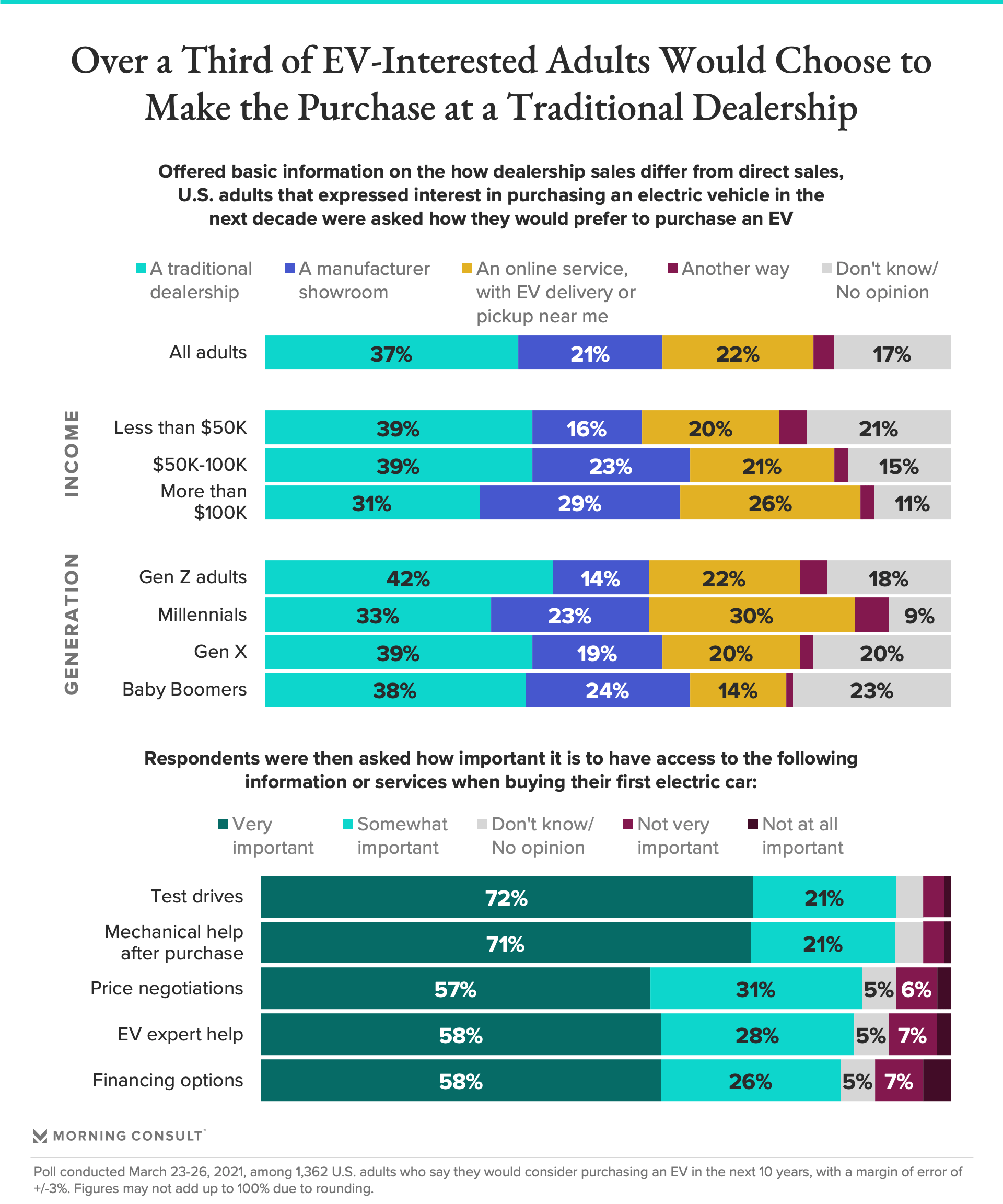 While the legal wranglings of the direct sales debate are likely not within the wheelhouse of the average consumer, when prompted with some basic information about the different sale models, respondents overall were split in their preferred EV-purchasing experience, with 37 percent of adults who expressed some interest in purchasing an EV choosing a traditional dealership and 21 percent choosing a manufacturer showroom.