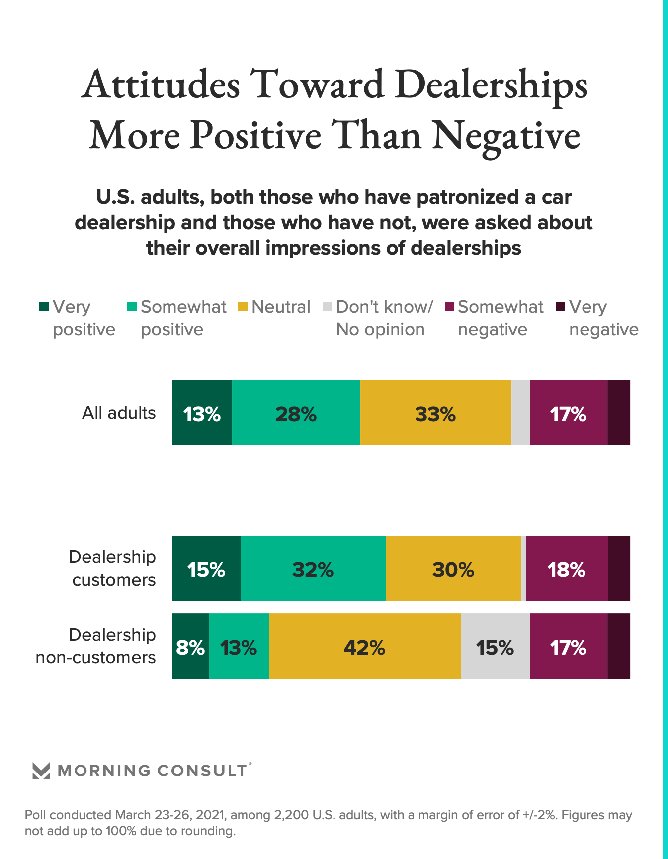 41% of adults said they have a positive impression of car dealerships, while 22% said their impression is negative and a third have a neutral impression.