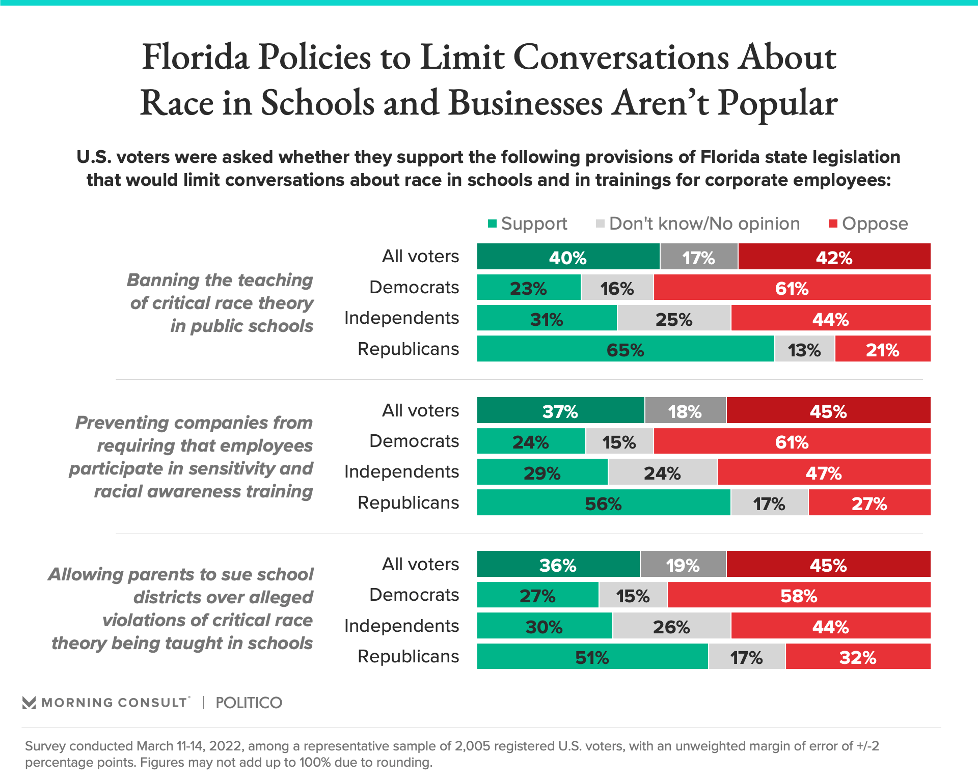 - Fewer voters (40 percent) support allowing parents to sue school districts over alleged violations of sexual orientation and gender identity discussions in schools, and 44 percent oppose the policy.