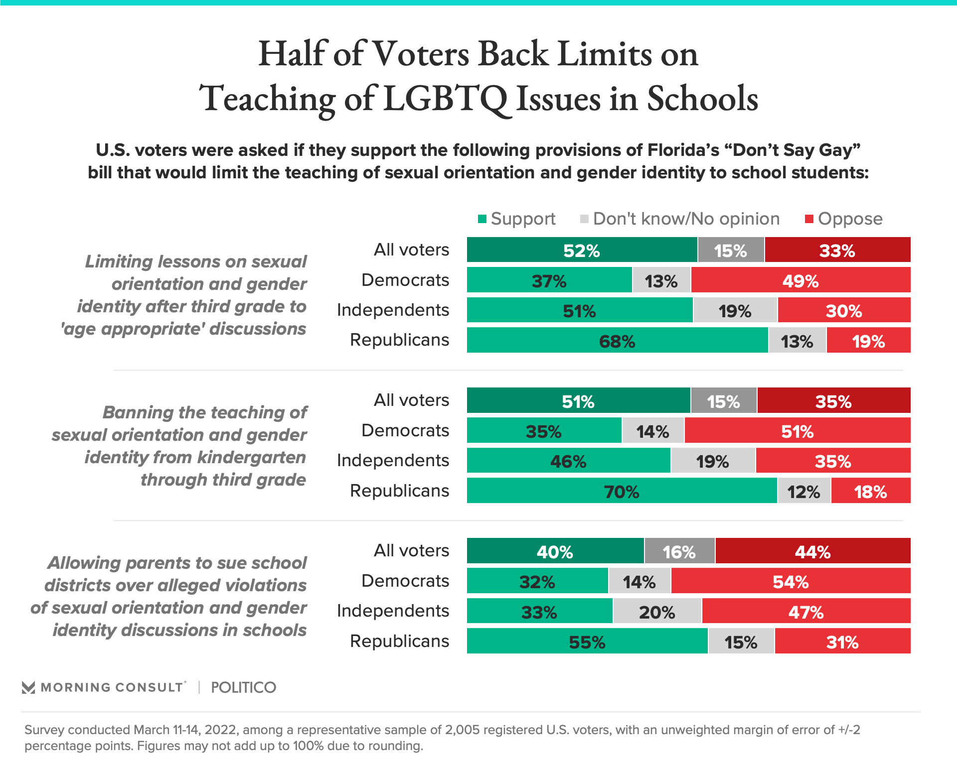 A slim majority of voters support key provisions of Florida state legislation that’s been dubbed the “Don’t Say Gay” bill by critics, but they are divided over whether parents should be able to sue schools over discussions of sexual orientation and gender identity, according to a new Morning Consult/Politico survey.