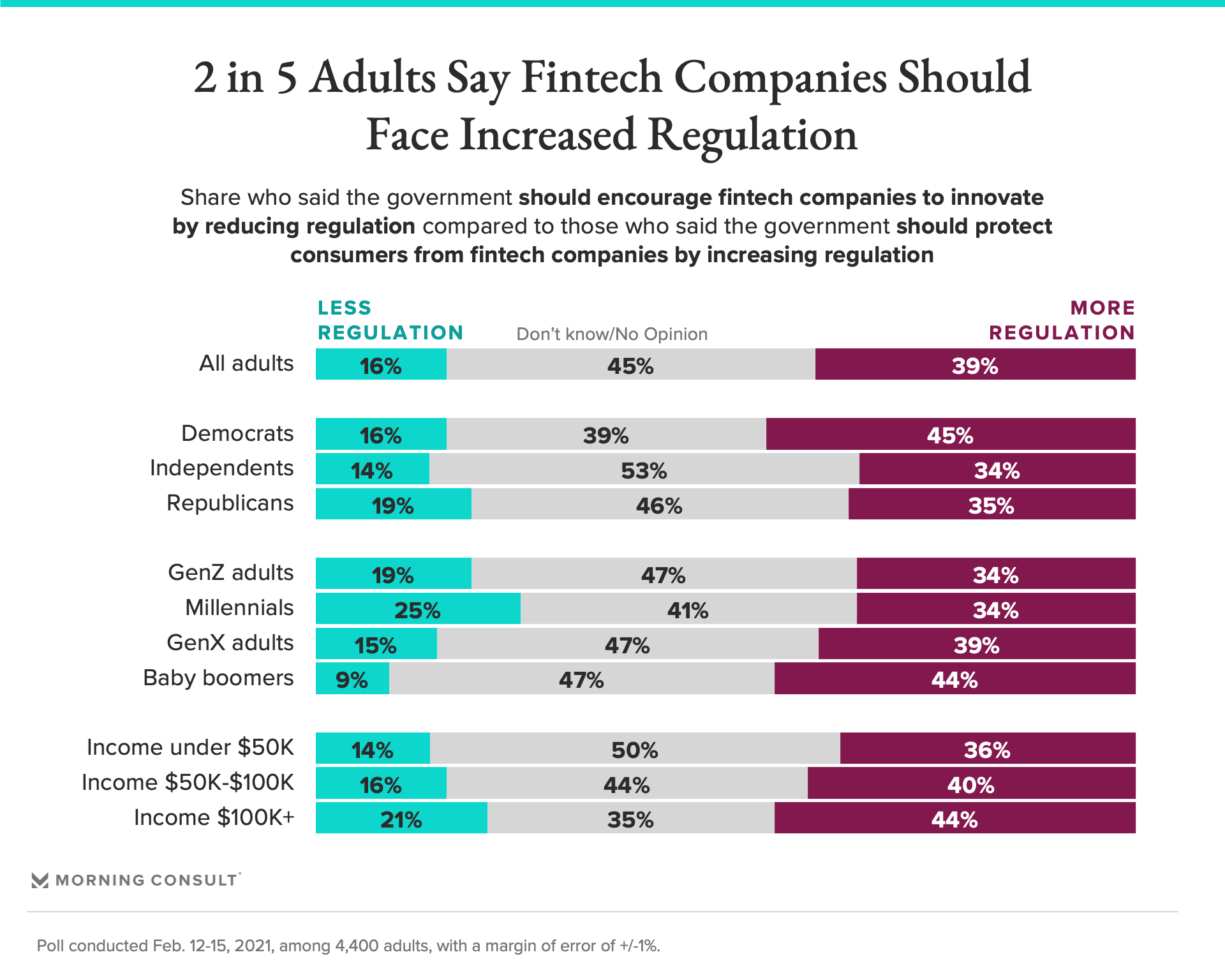 It’s unclear how much heat the financial technology industry will take during the Biden administration, especially after the role Robinhood Markets Inc. played in the the GameStop saga. But according to a new Morning Consult poll, at least, much of the public seems more concerned about consumer protection than lifting regulatory burdens for fintechs.