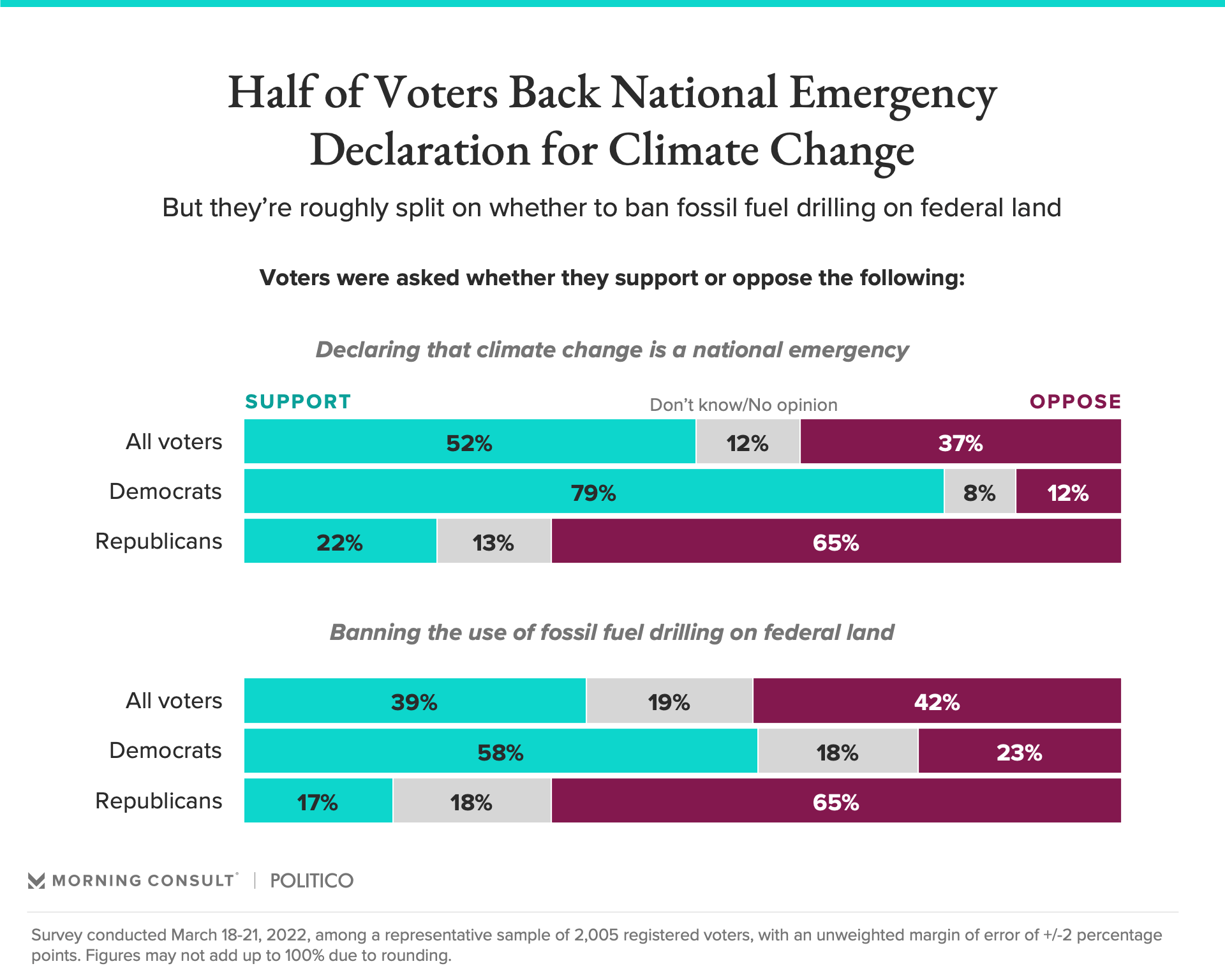 - In the survey, 52% of voters said they support the declaration of climate change as a national emergency, with 37% opposed. Nearly 4 in 5 Democrats supported the proposal, while about 65% of Republicans opposed it.