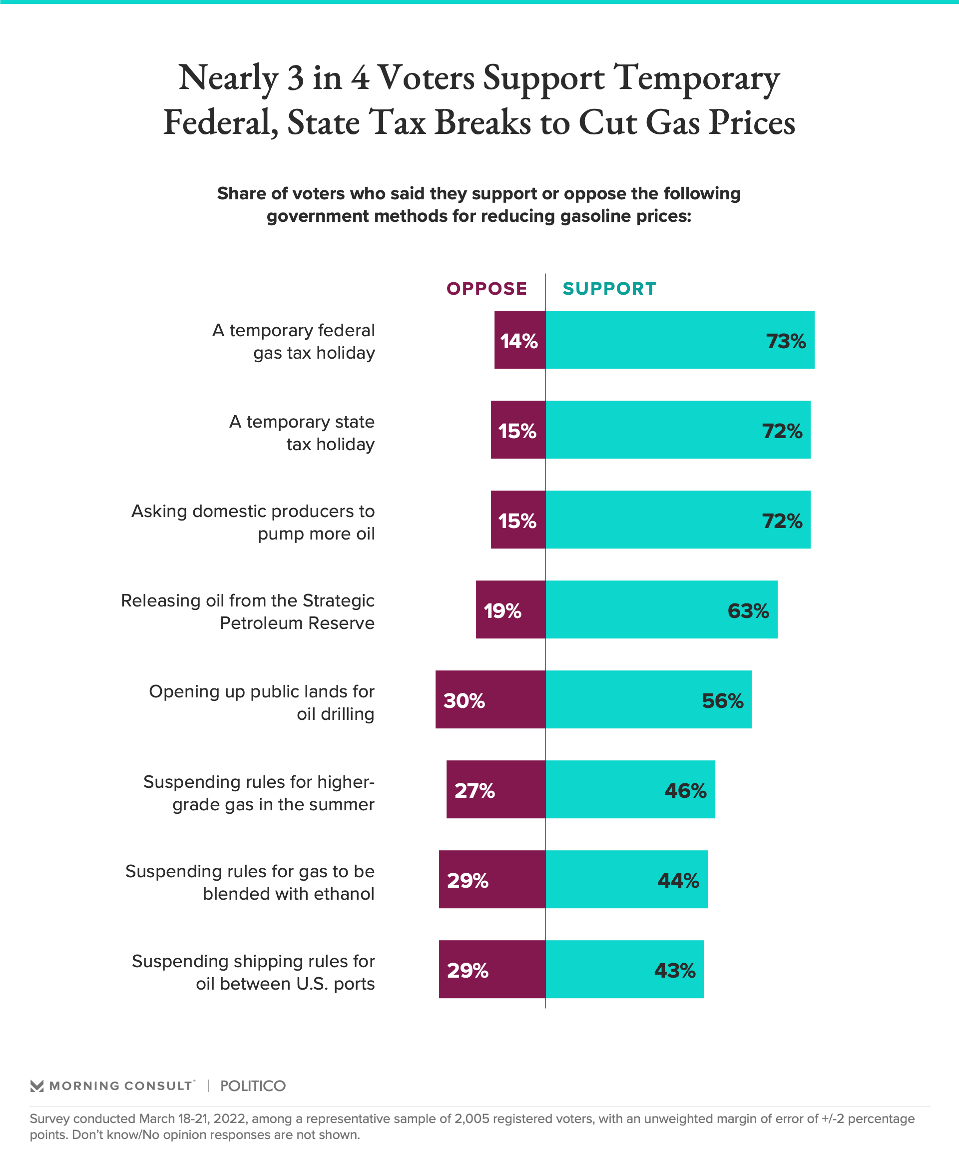 As state and federal officials mull different measures to reduce the price at the pump, a new Morning Consult/Politico survey shows that voters support temporary breaks on gas taxes and measures to boost domestic oil production in order to ease soaring gas prices.