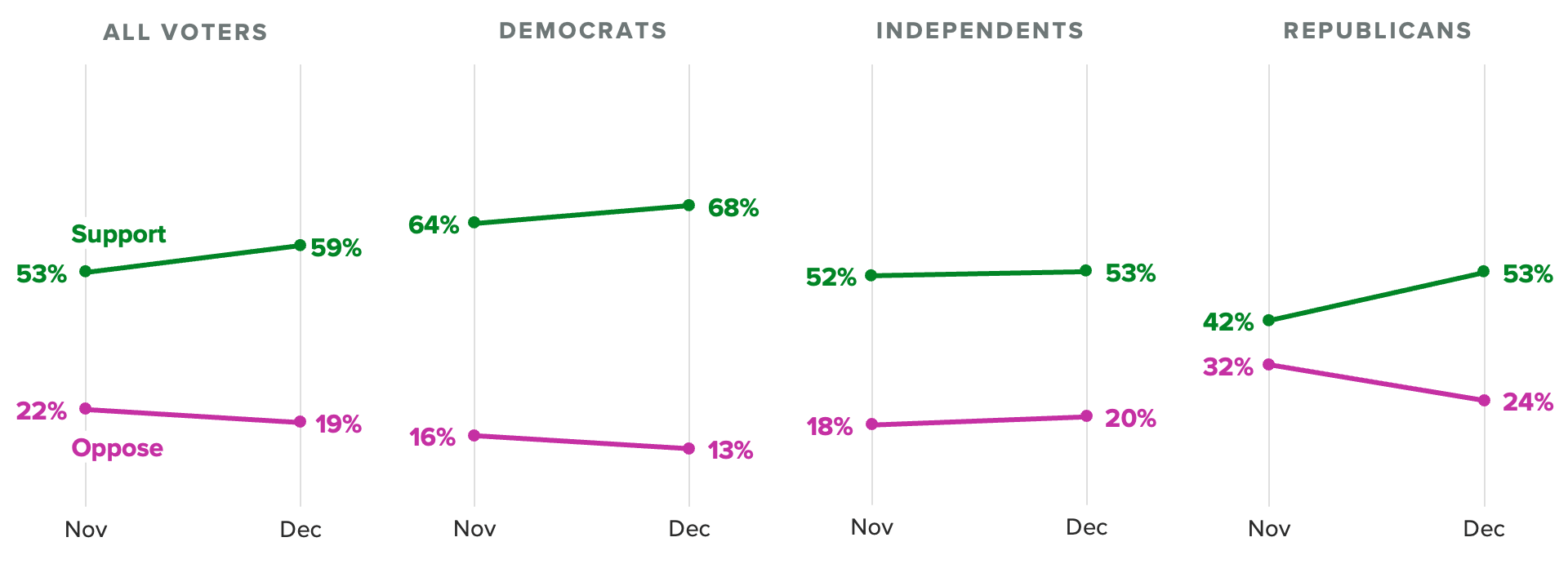 According to our latest survey, nearly 3 in 5 voters (59%) support calls for a cease-fire in the Israel-Hamas war, up from 53% in mid-November. Increased backing for truce came from across the partisan spectrum, but notably from Republican voters, 53% of whom now support a cease-fire — up 11 percentage points over the past month.