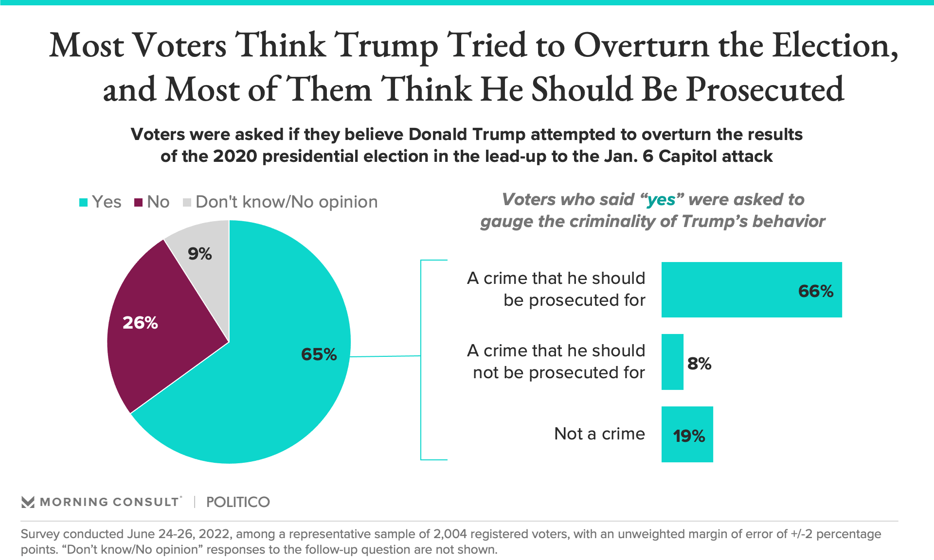 - Among voters who believe Trump attempted to overturn the 2020 result, 3 in 4 think Trump committed a crime, accounting for roughly half of the overall electorate.