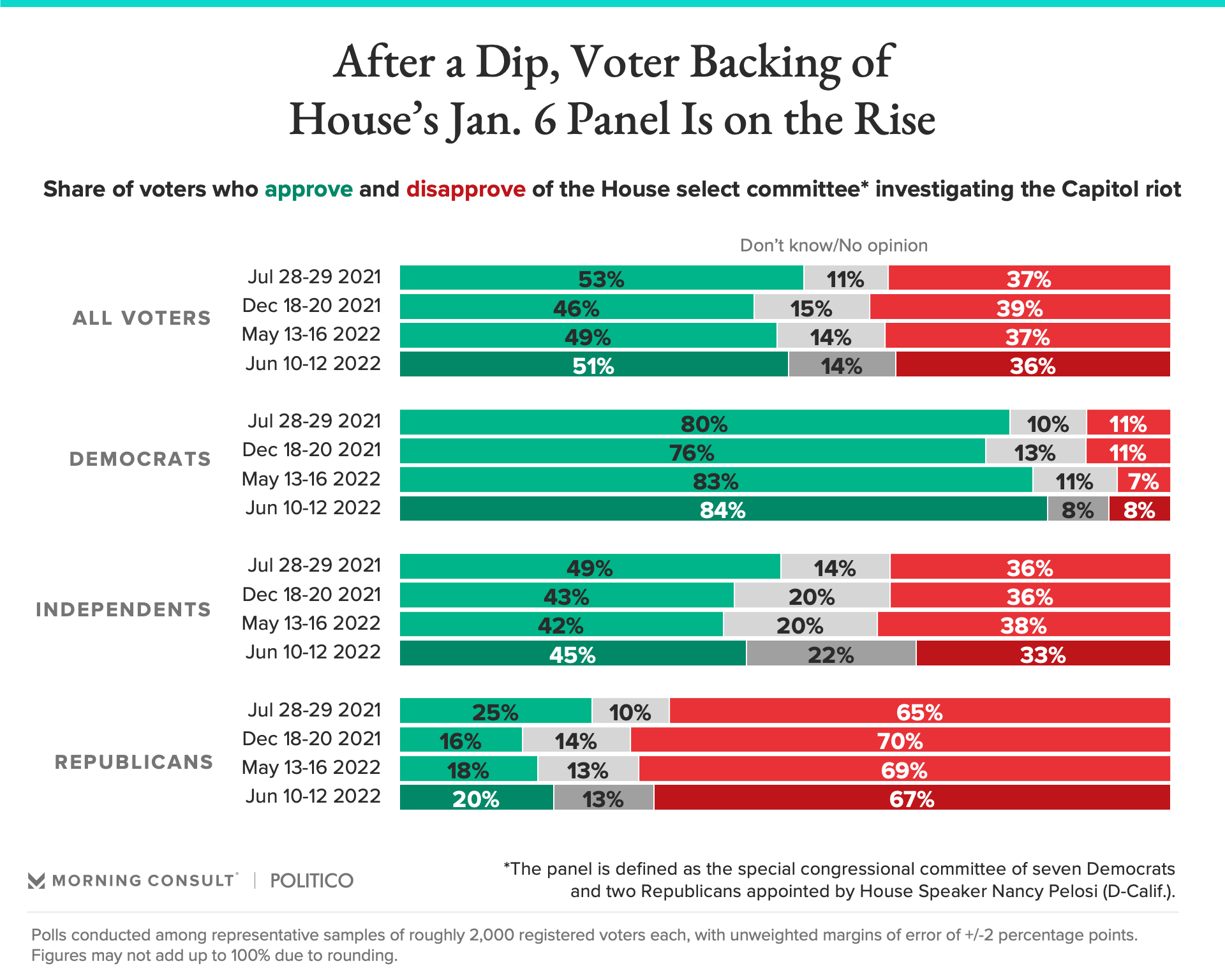 In the wake of last week’s prime-time hearing by the special committee investigating the Jan. 6 Capitol attack, a new Morning Consult/Politico survey shows more voters approve of the panel than they have in months, though they are no more likely to blame former President Donald Trump for the failed insurrection.