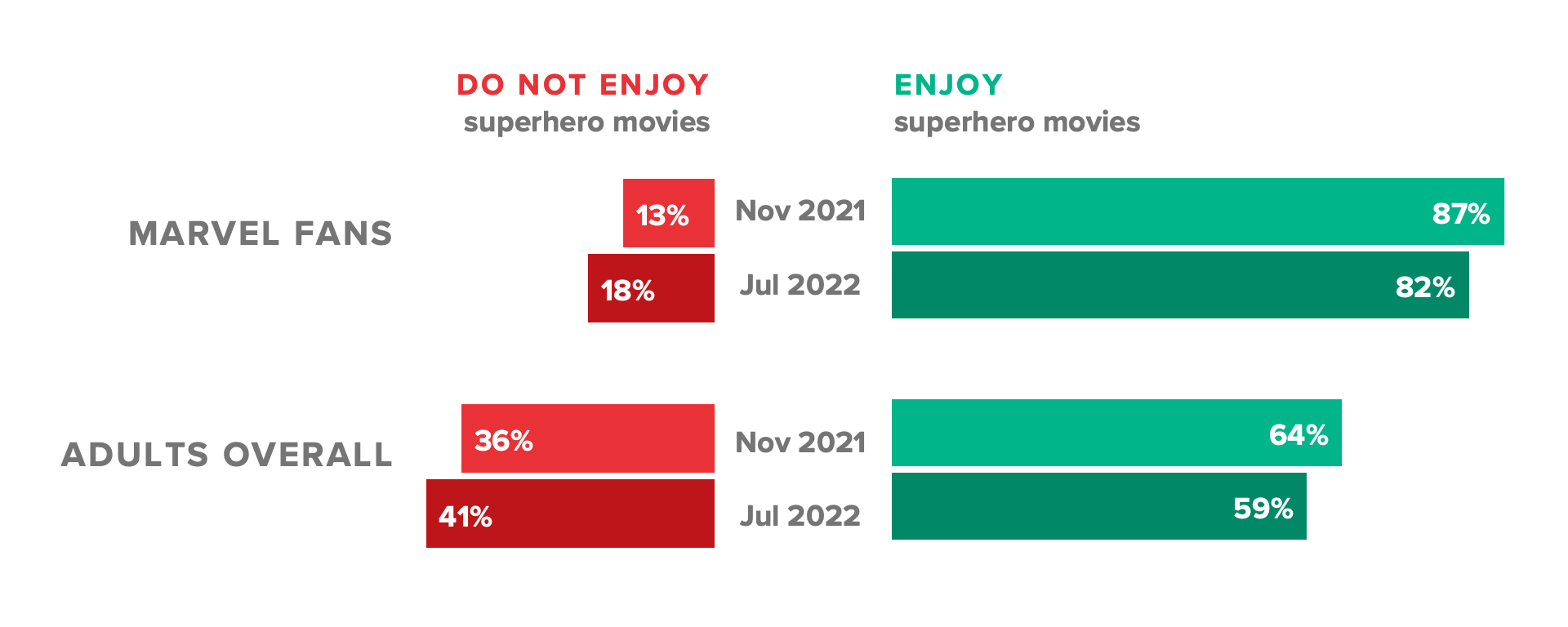 - The share of adults who said they enjoy superhero movies dropped 5 percentage points from 64% in November to 59% in a late July survey conducted following the Comic-Con announcements. Meanwhile, the share of adults who do not enjoy superhero movies jumped 5 points in that time, from 36% to 41%. That share has increased 9 points since a 2018 survey.