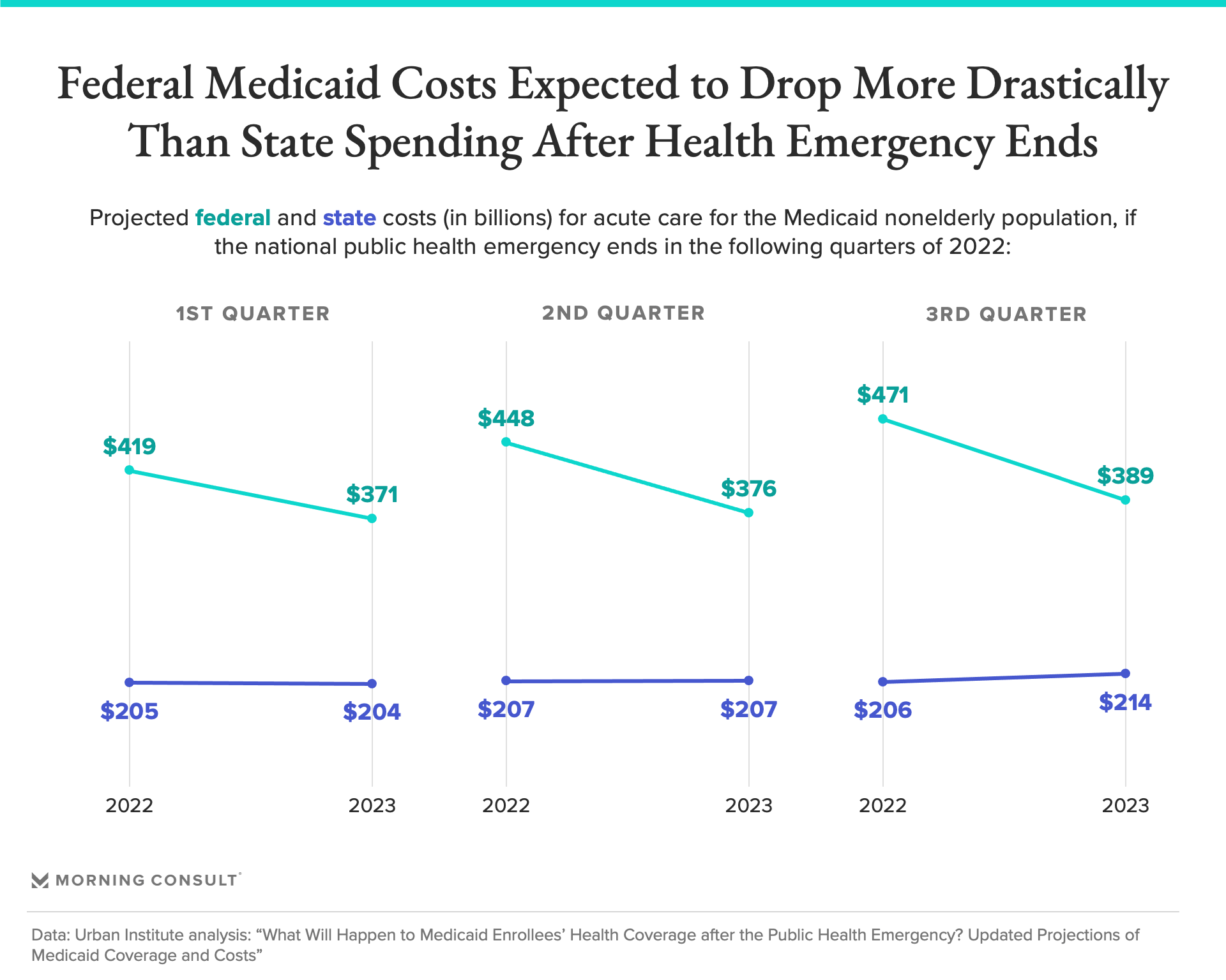 Federal and state spending on acute care for nonelderly patients will reach $583 billion in 2023 if the public health emergency ends in Q2, Urban Institute estimates show.