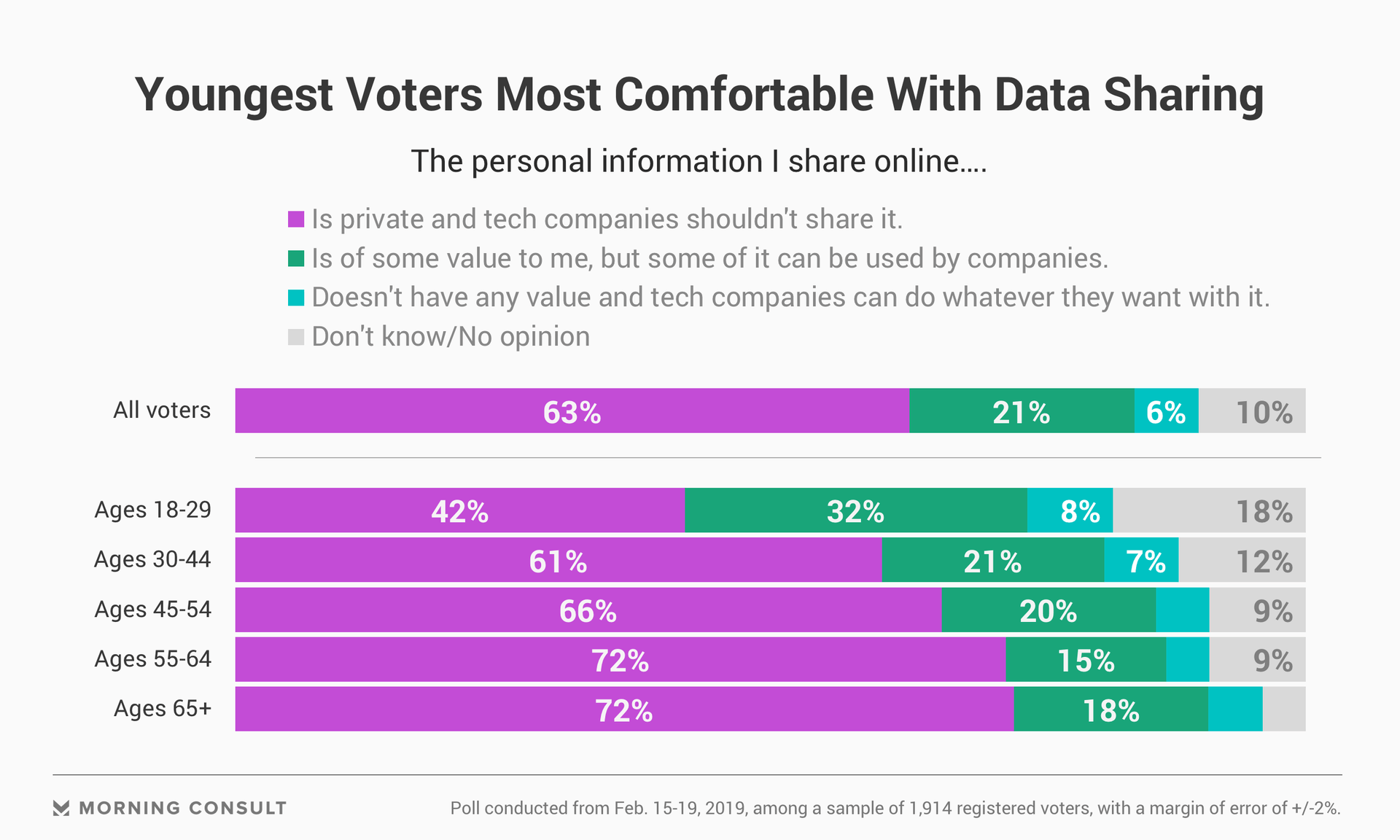 The youngest voters were more likely to tolerate companies' use of some of their data: Forty-two percent agreed that their information is private and companies shouldn’t have it and 32 percent said it had “some value” and can be used in some cases.