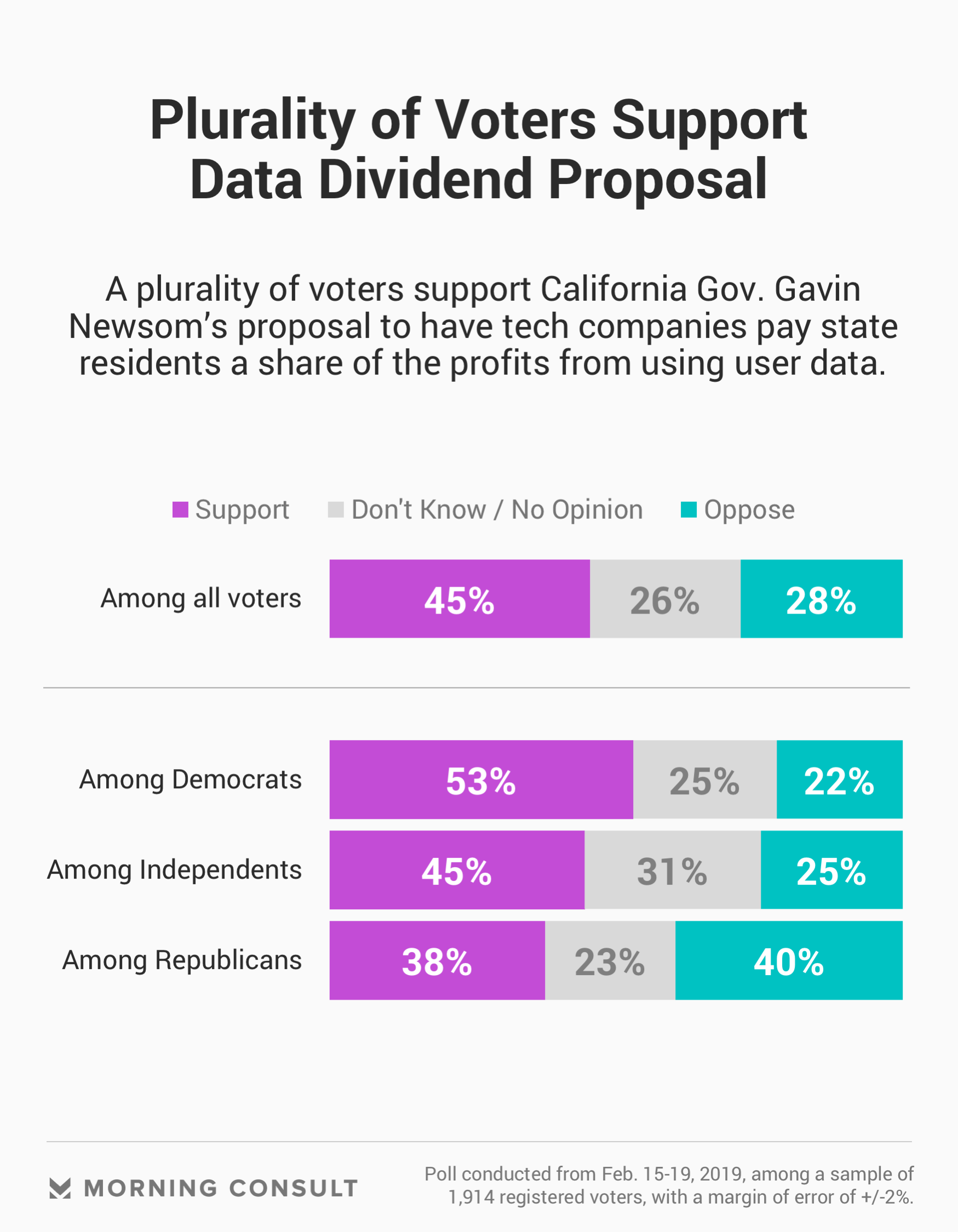45% support a plan for California residents to receive payments from big tech companies that profit off of their personal information, while 28% oppose.