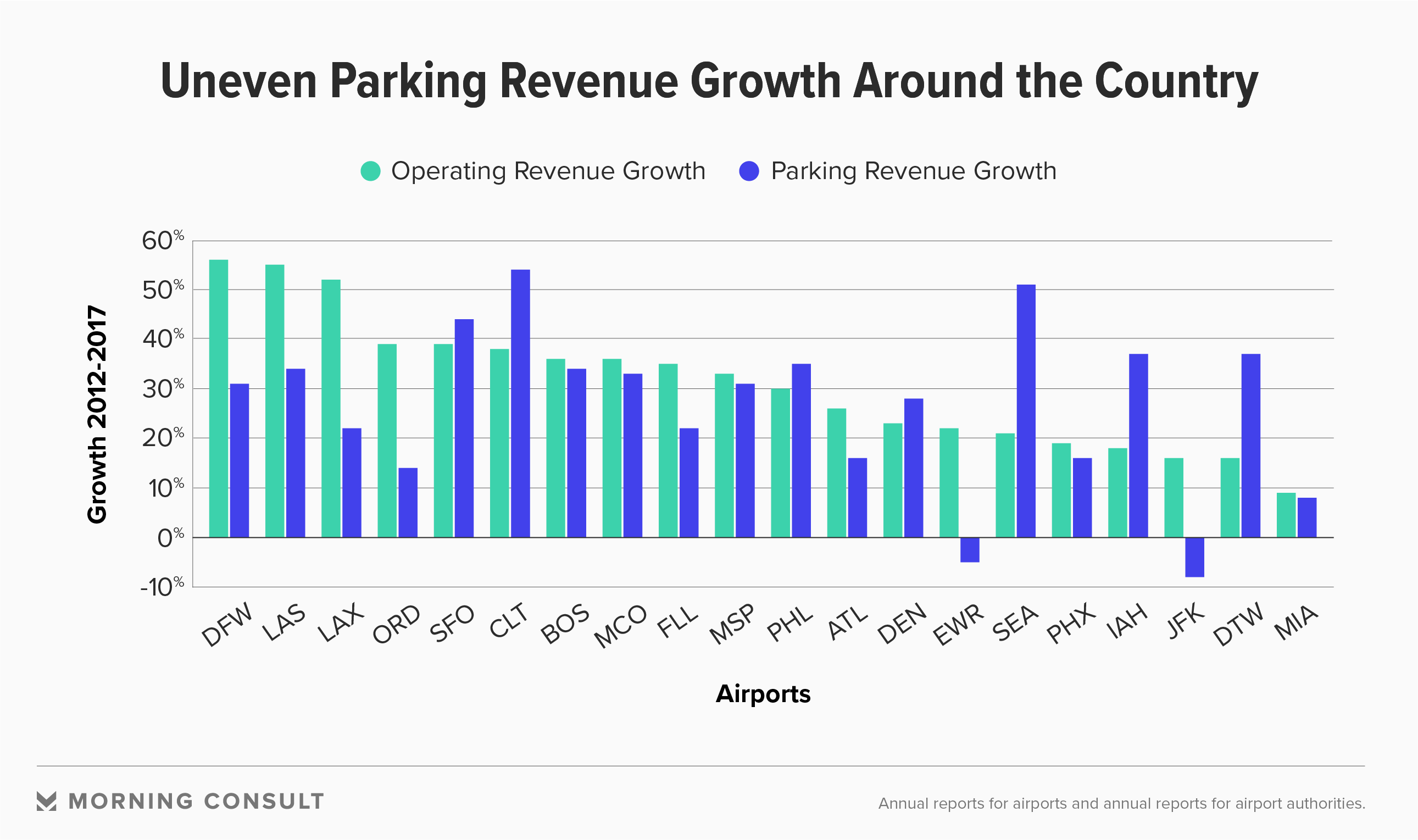 But a new Morning Consult analysis shows the range in airport parking revenue across the country, with some airports’ parking revenue outpacing that of its operating revenue, somewhat rebuking industry predictions.