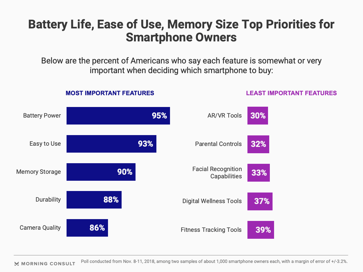 When asked what they considered important factors when deciding what phone to buy, battery life (95 percent), ease of use (93 percent), memory storage size (90 percent) and durability (88 percent) topped the list of priorities for consumers in a Nov. 8-11 poll that surveyed 1,894 smartphone owners. More advanced technological features such as augmented and virtual reality tools (30 percent), parental controls (32 percent), facial recognition capabilities (33 percent) and digital wellness tools to track phone usage (37 percent) sat at the bottom of the list of important factors among consumers.