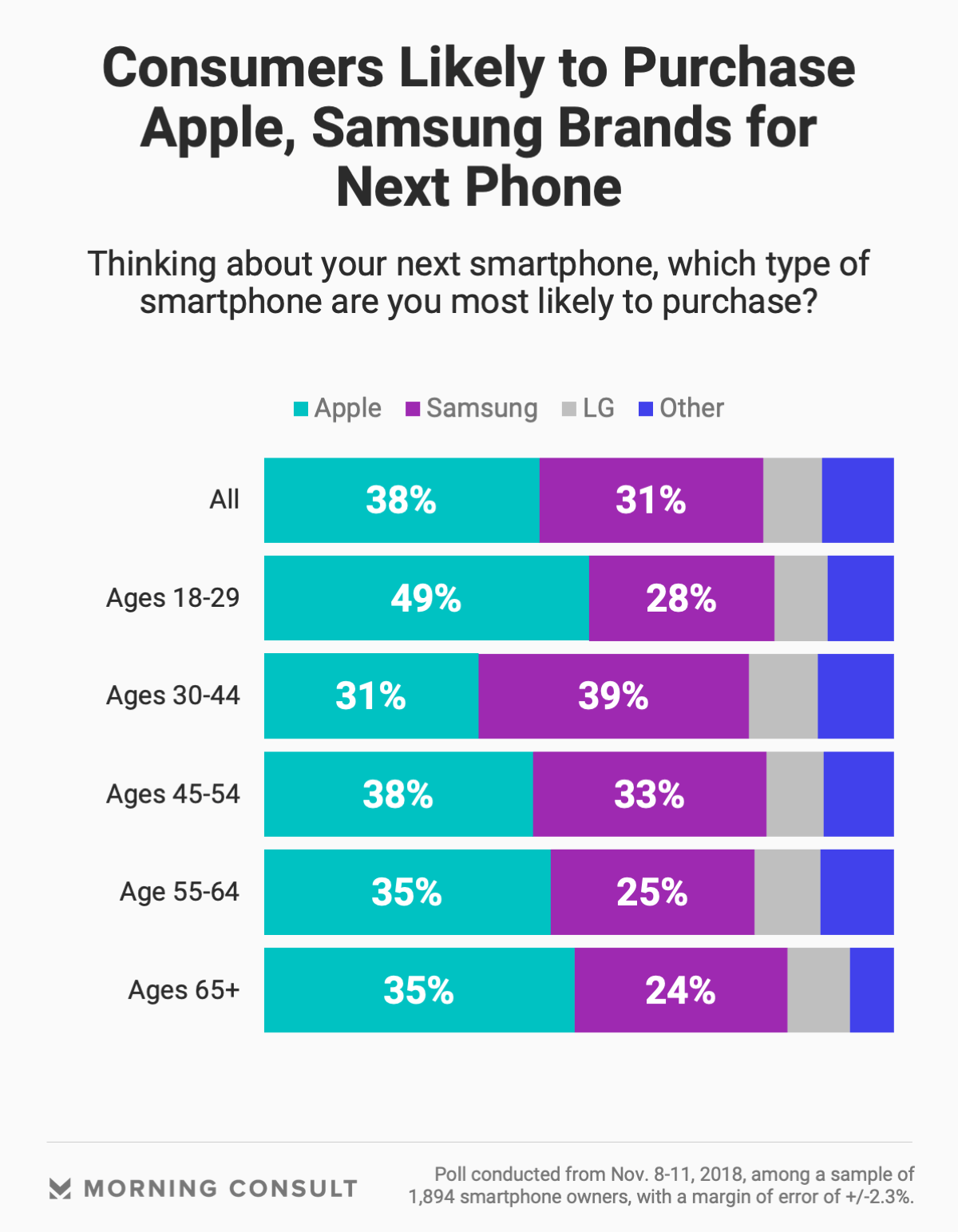 A lot of that marketing could be the result of high market saturation: The recent poll shows that 86 percent of adults say they own a smartphone already. A plurality of smartphone owners (39 percent) said they own an Apple iPhone, 30 percent have a Samsung device and 14 percent have a device from LG, while other smartphone manufacturers such as Google and Motorola netted a total of 14 percent. When thinking about their next smartphone purchase, 38 percent said they are most likely to purchase an Apple device, 31 percent said Samsung and 8 percent said LG. The poll of smartphone owners has a margin of error of 2.3 percentage points.