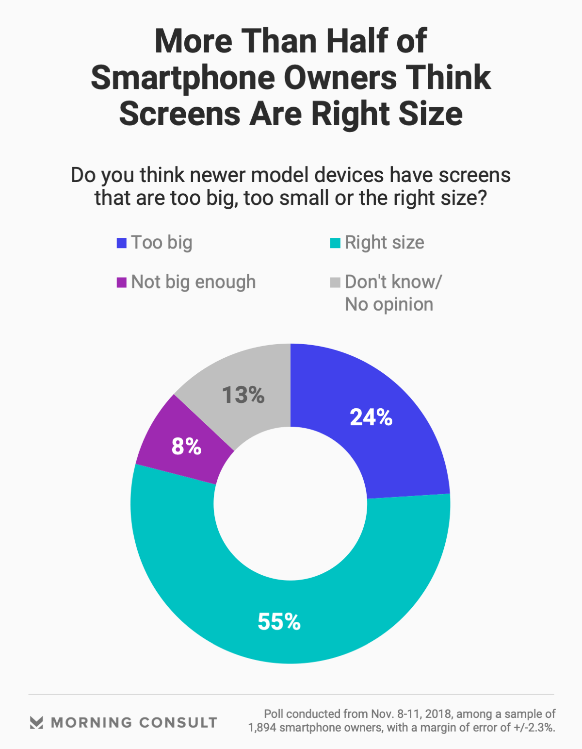 Amid phone manufacturers’ efforts to continue increasing the size of their devices,with Apple’s latest iPhone, the XS Max, boasting a 6.5-inch display screen (a full inch bigger than the 2016 iPhone 7 Plus’ 5.5-inch screen size) 55 percent of all smartphone owners said newer models have a phone screen that is the right size, while 24 percent said it was too big.