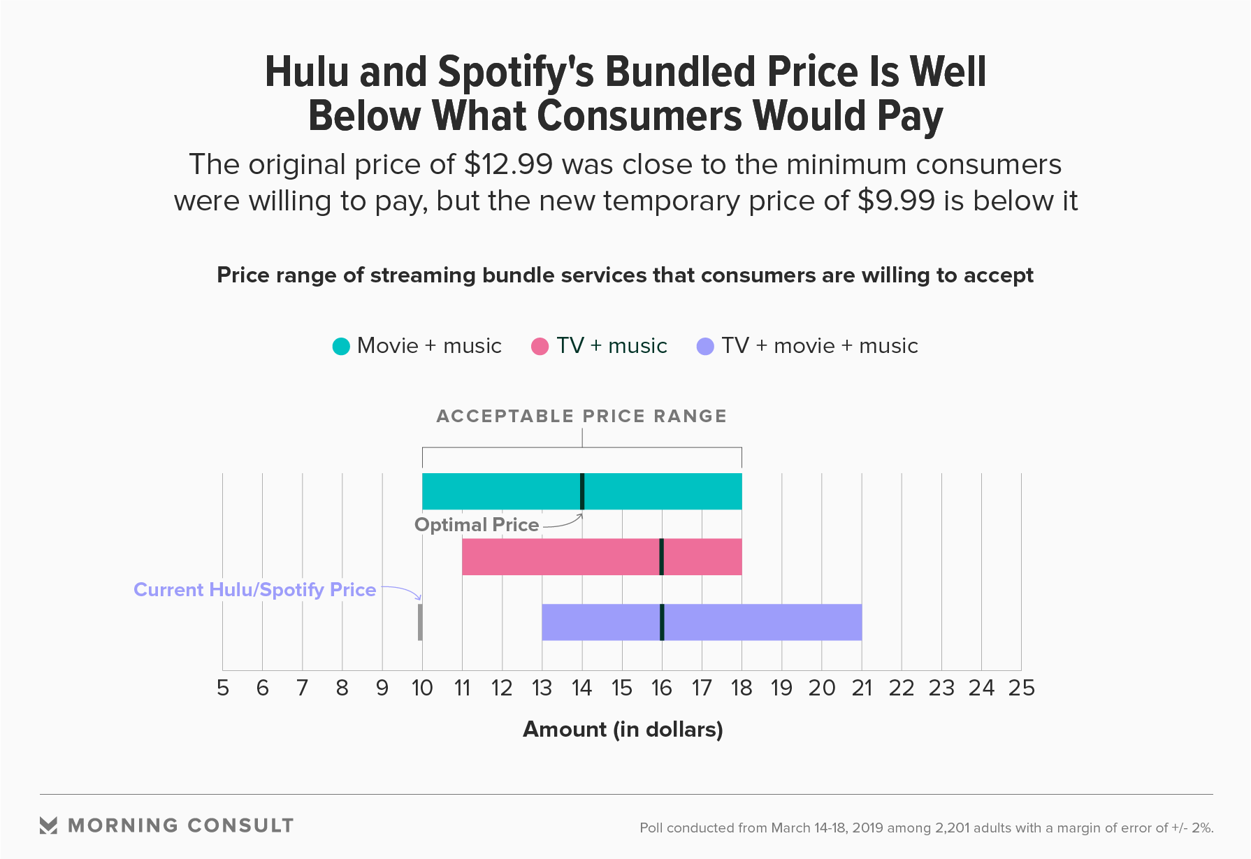 A March 14-18 Morning Consult/The Hollywood Reporter poll asked 2,201 adults about their views on the pricing of the kind of streaming services bundle Spotify and Hulu are offering, which is TV and movies plus music.