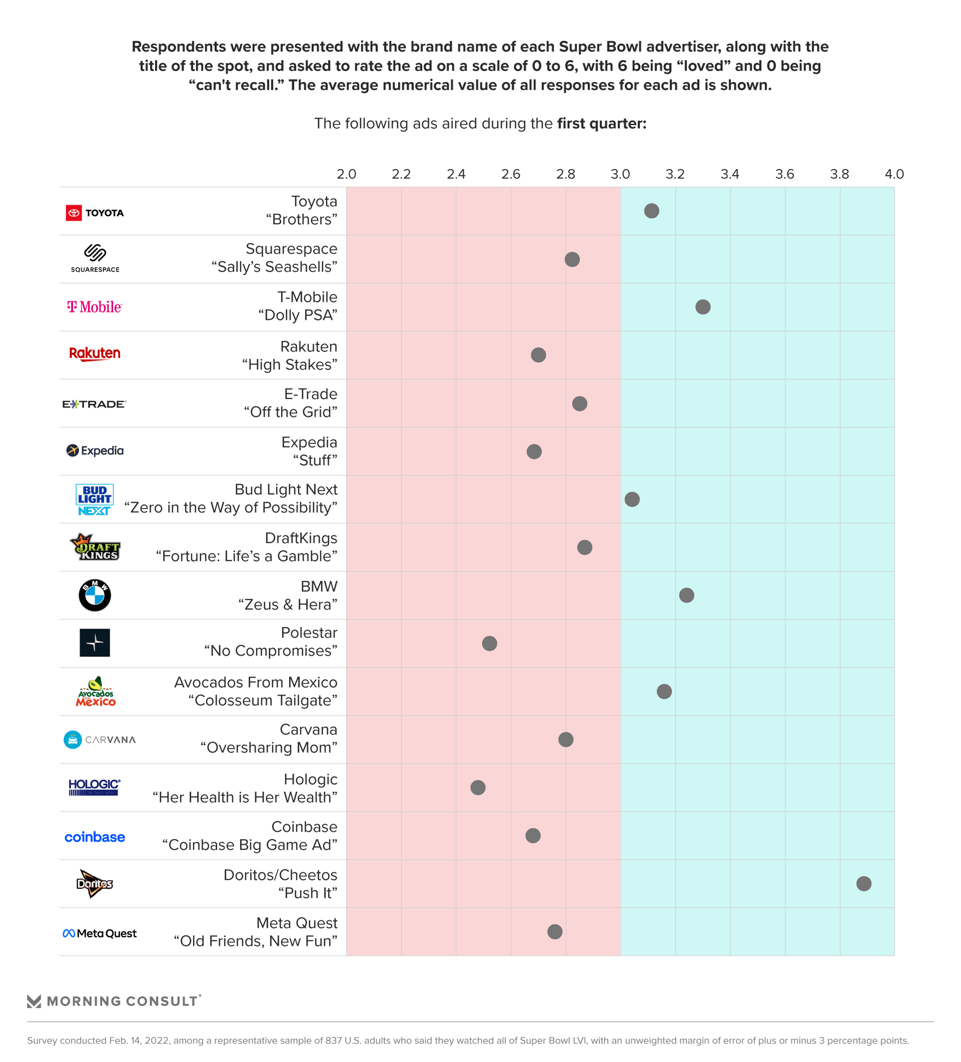 How it works: Morning Consult’s Most-Loved Ads of Super Bowl LVI is based on a next-day survey of 837 U.S. adults who said they watched all of Sunday’s game. Respondents were presented with the brand name of each Super Bowl advertiser, along with the title of the spot, and asked to rate the ad on the following scale: