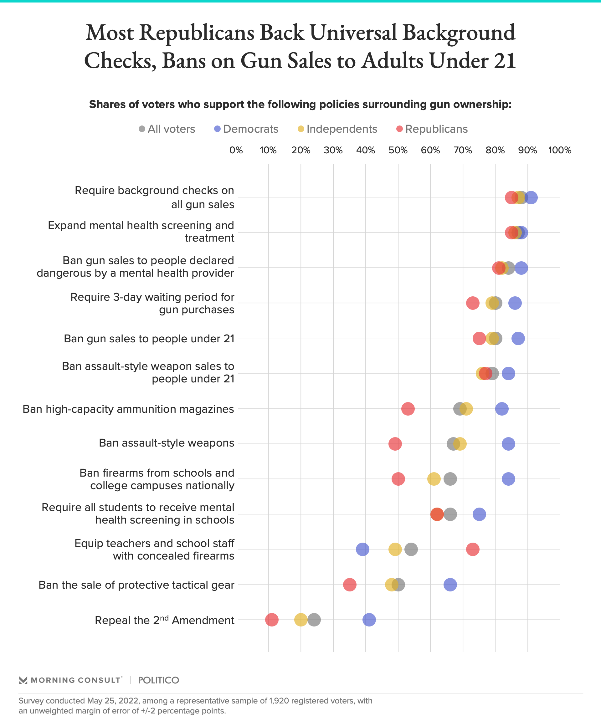 - Two in 3 independent voters said they want stronger gun laws, up 10 percentage points from the post-Buffalo shooting survey.