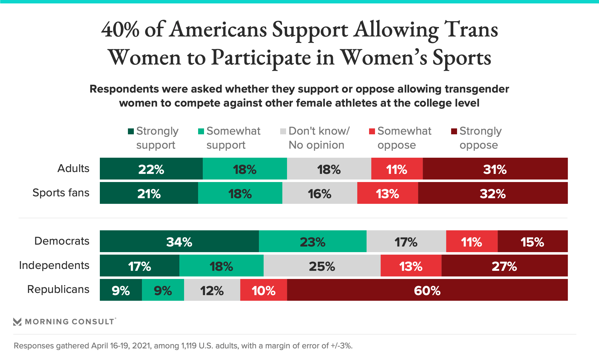 In a Morning Consult survey conducted April 16-19, 40 percent of U.S. adults said they support allowing transgender women to compete in women’s sports at the collegiate level, while 42 percent opposed their participation. Opinions about transgender participation in high school girls’ sports and professional women’s sports were virtually the same. Nearly 1 in 3 Americans, including 60 percent of Republicans, said they “strongly oppose” allowing transgender women to play sports against other women in college.