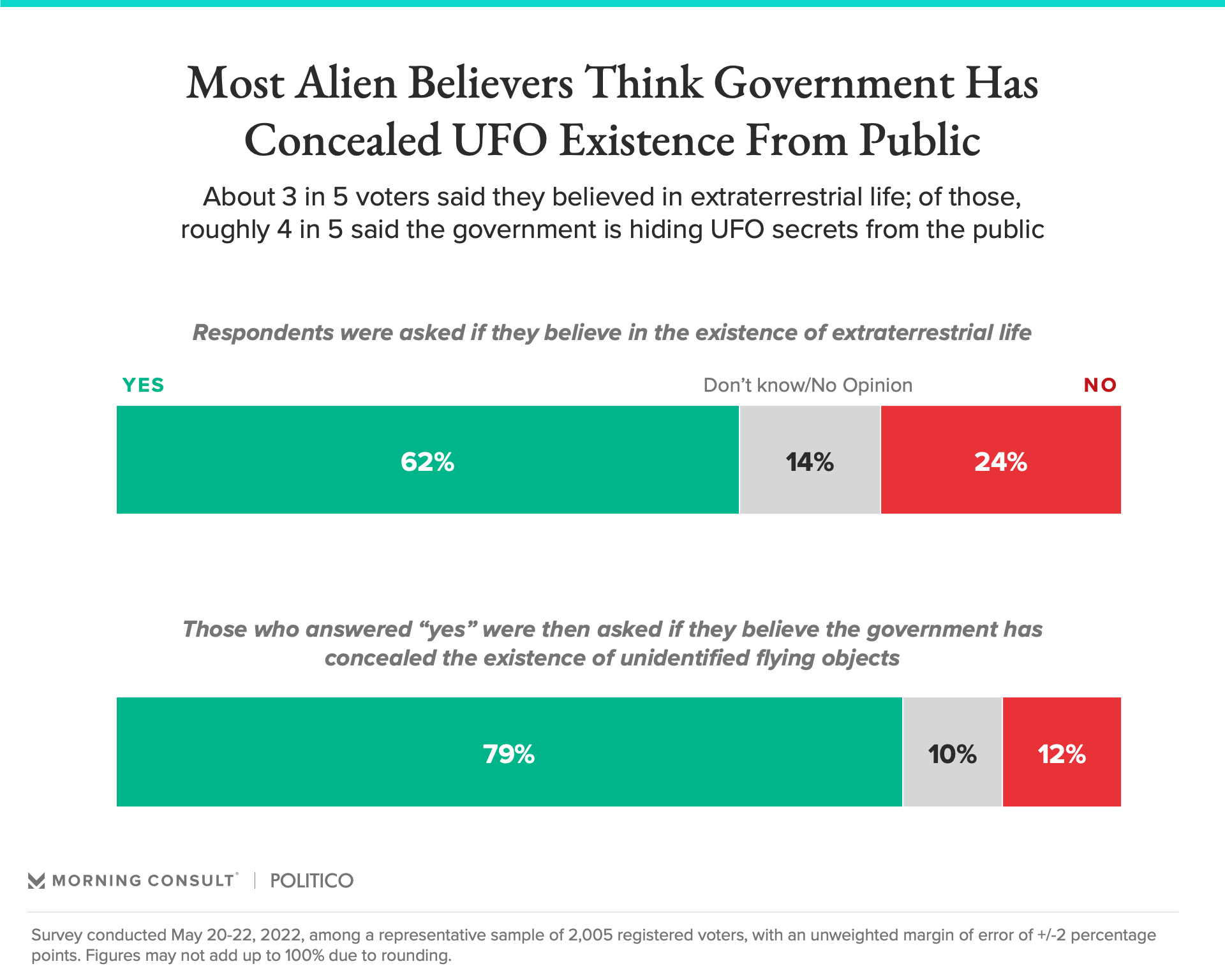 The phenomena of unidentified flying objects returned to Congress for the first time in decades last week for a rare hearing about their existence. And it appears most registered voters are believers: The latest Morning Consult/Politico survey shows 62% of voters think there is extraterrestrial life, and of those, 79% believe the government has concealed the existence of UFOs from the public.