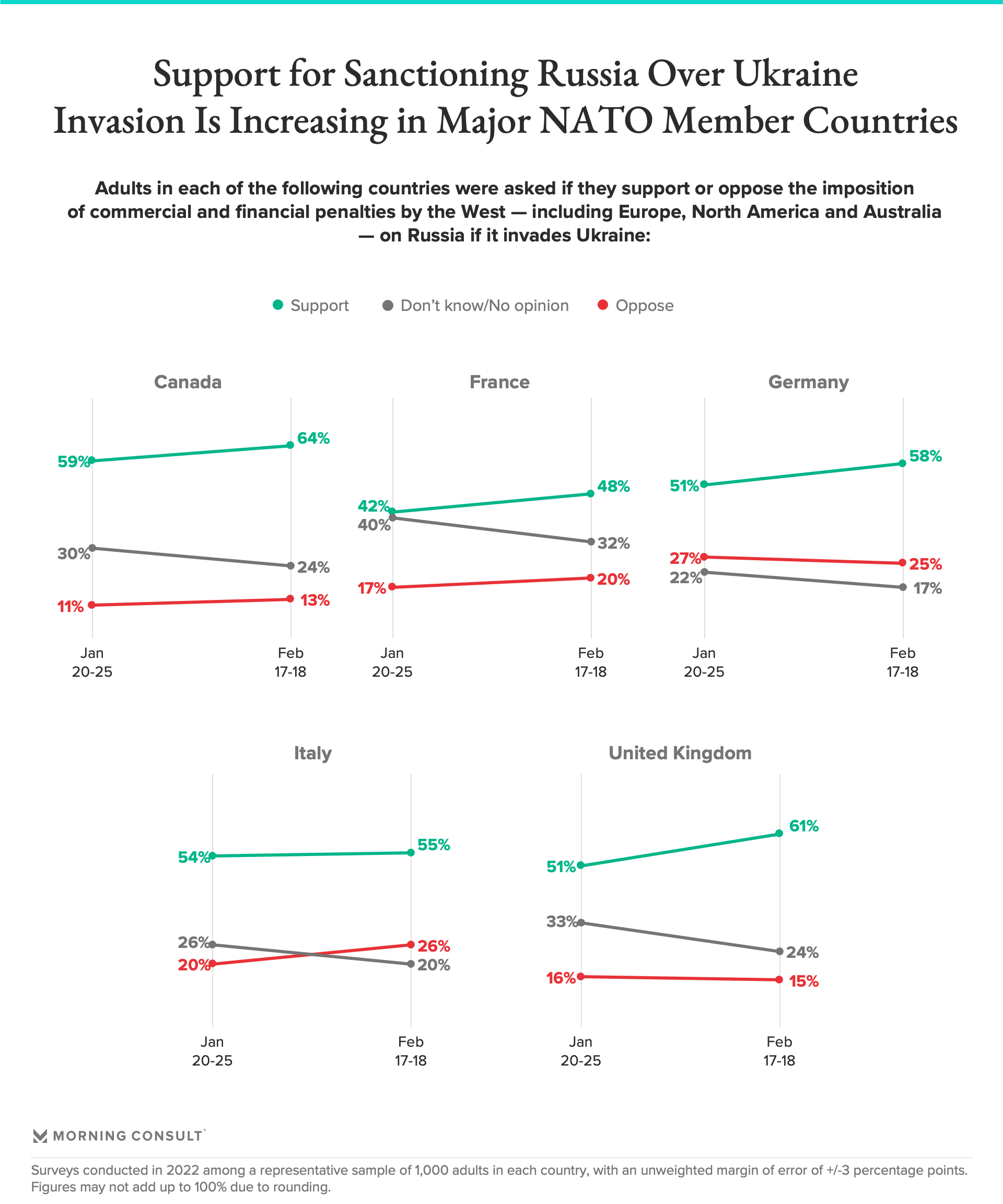 A comparison of the latest Morning Consult survey data to responses gathered Jan. 20-25 shows people in NATO countries have increasingly formed opinions about what should be done in Ukraine, with most coming out in favor of sanctions — but not Italy, which gets roughly 40 percent of its natural gas from Russia, and where opposition rose more.