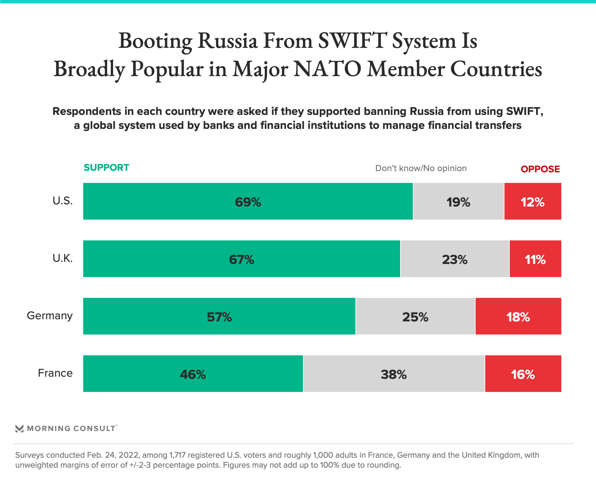 The West’s response to Russia’s invasion of Ukraine does not yet include one of the most biting provisions brought up over the preceding weeks: the expulsion of Russia from the SWIFT banking system that facilitates global trade and financial flows. Armed with a Kalashnikov carbine, former Ukrainian President Petro Poroshenko on Friday said Russian President Vladimir Putin had “declared a war to the whole world" by invading Ukraine and issued a plea for the West to cut Russia out of the world financial system in response. Clear majorities in the United States, United Kingdom and Germany say they now support such a move, as do nearly half of the French.