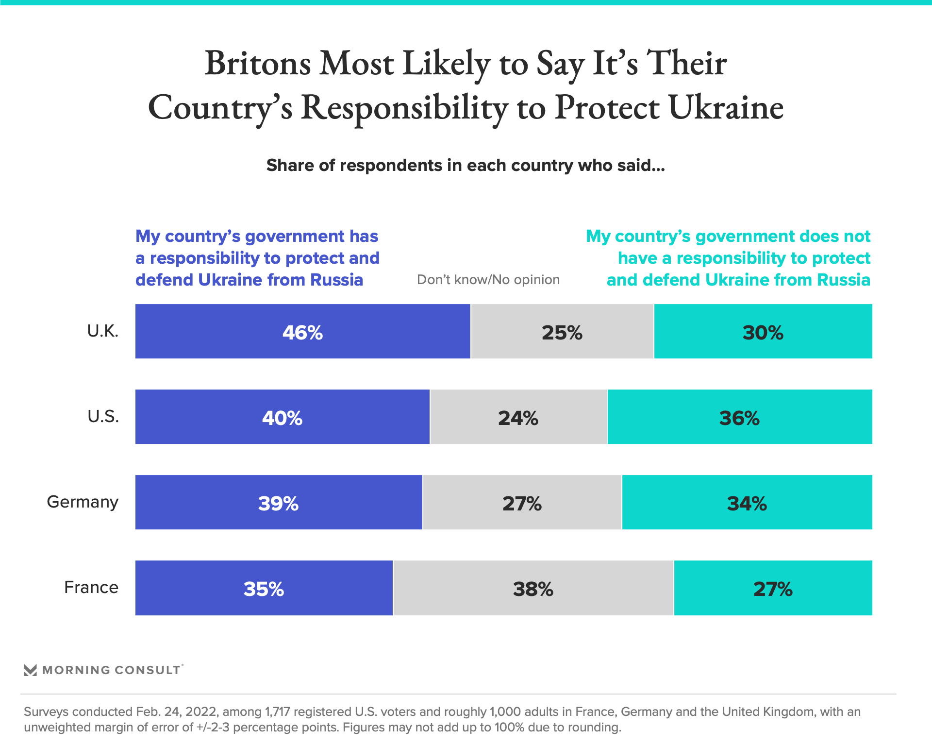 - Nearly half (46 percent) of British adults surveyed on Feb. 24 said their country's government has a responsibility to protect and defend Ukraine from Russia, compared with 40 percent of U.S. voters, 39 percent of German adults and 35 percent of French adults. Only in the United Kingdom was that sense of responsibility approaching a consensus.