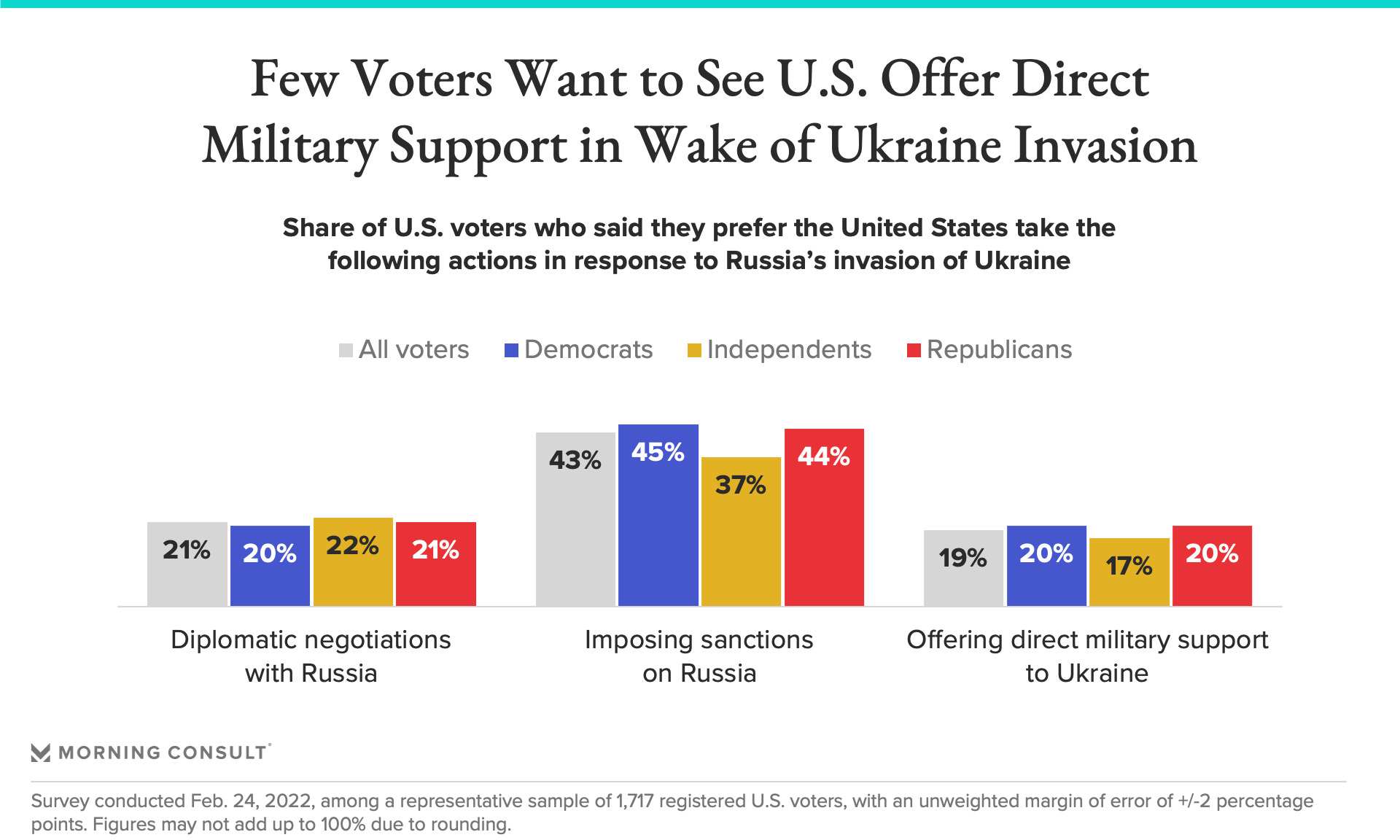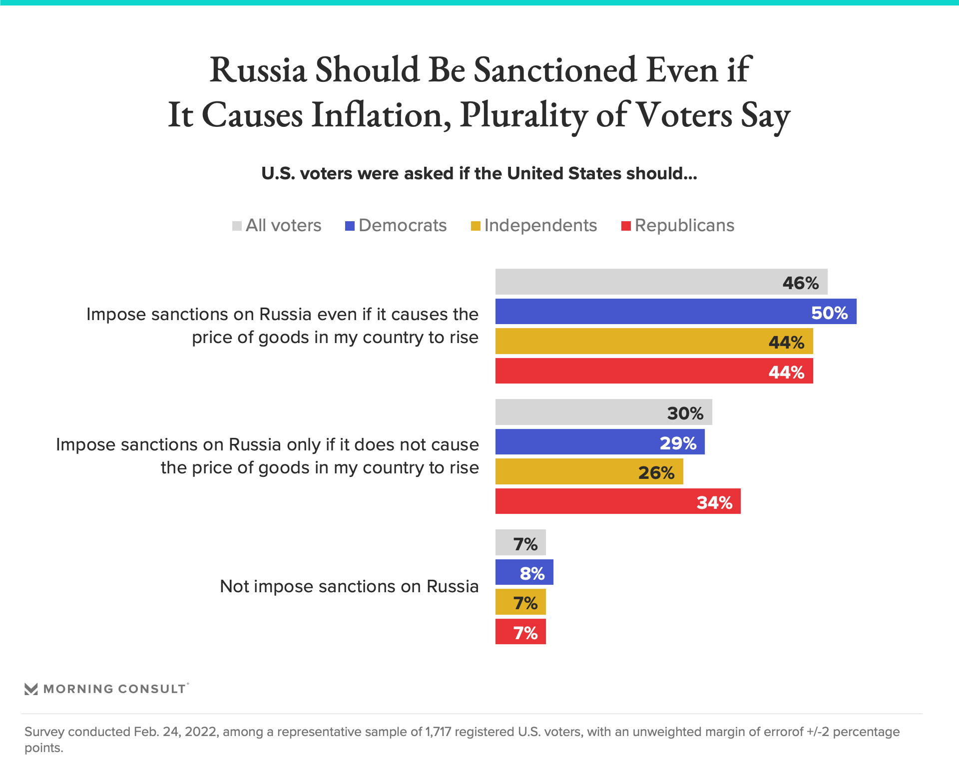 As President Joe Biden walks a tightrope of formulating a tough response amid already surging inflation at home, nearly half of U.S. voters surveyed by Morning Consult following Russia’s invasion of Ukraine support sanctions against Moscow even if it leads to increased prices. Only 7 percent of voters, meanwhile, say they are opposed to sanctions in any case.