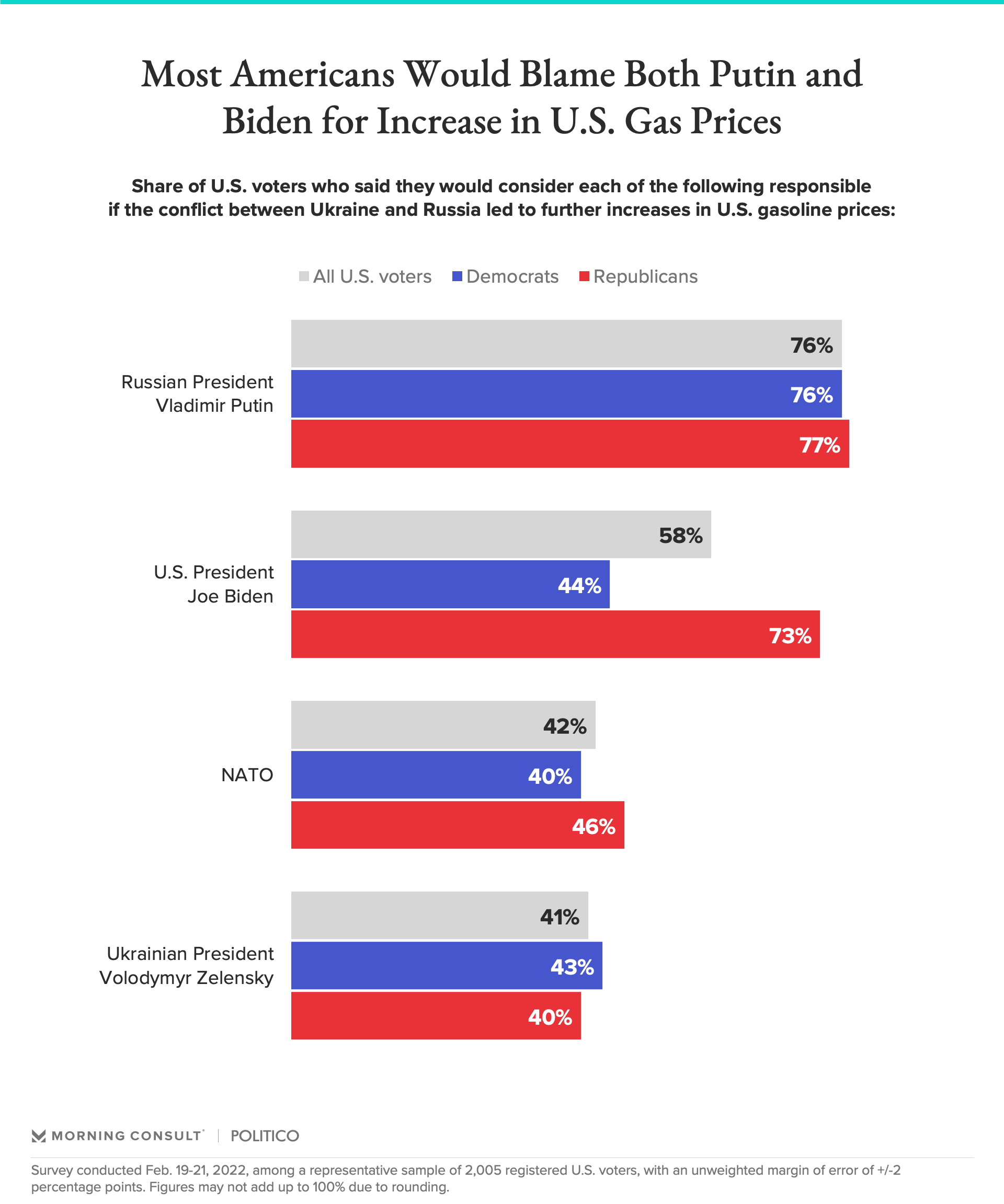 Unfortunately for Democrats, despite support for sanctions against Russia in response to an invasion of eastern Ukraine, a majority of U.S. voters said they would also blame the president for any further gas price hikes that would result from the conflict, according to a new Morning Consult/Politico survey.