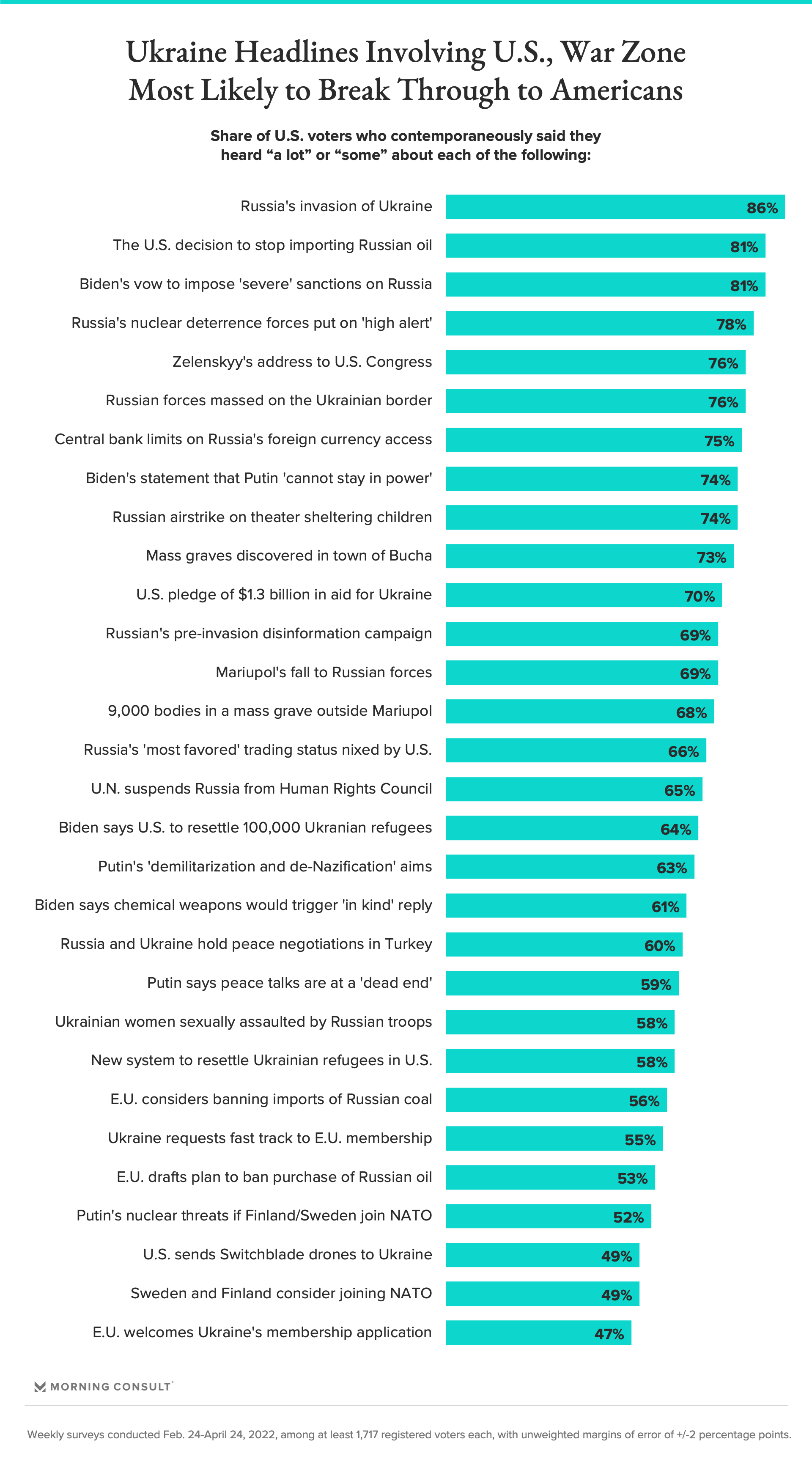 - Many of the stories that broke through after the invasion were those with an impact on American pocketbooks: 81% of voters apiece said they heard of President Joe Biden’s promise to impose “severe sanctions” and the decision to sanction Russian oil.