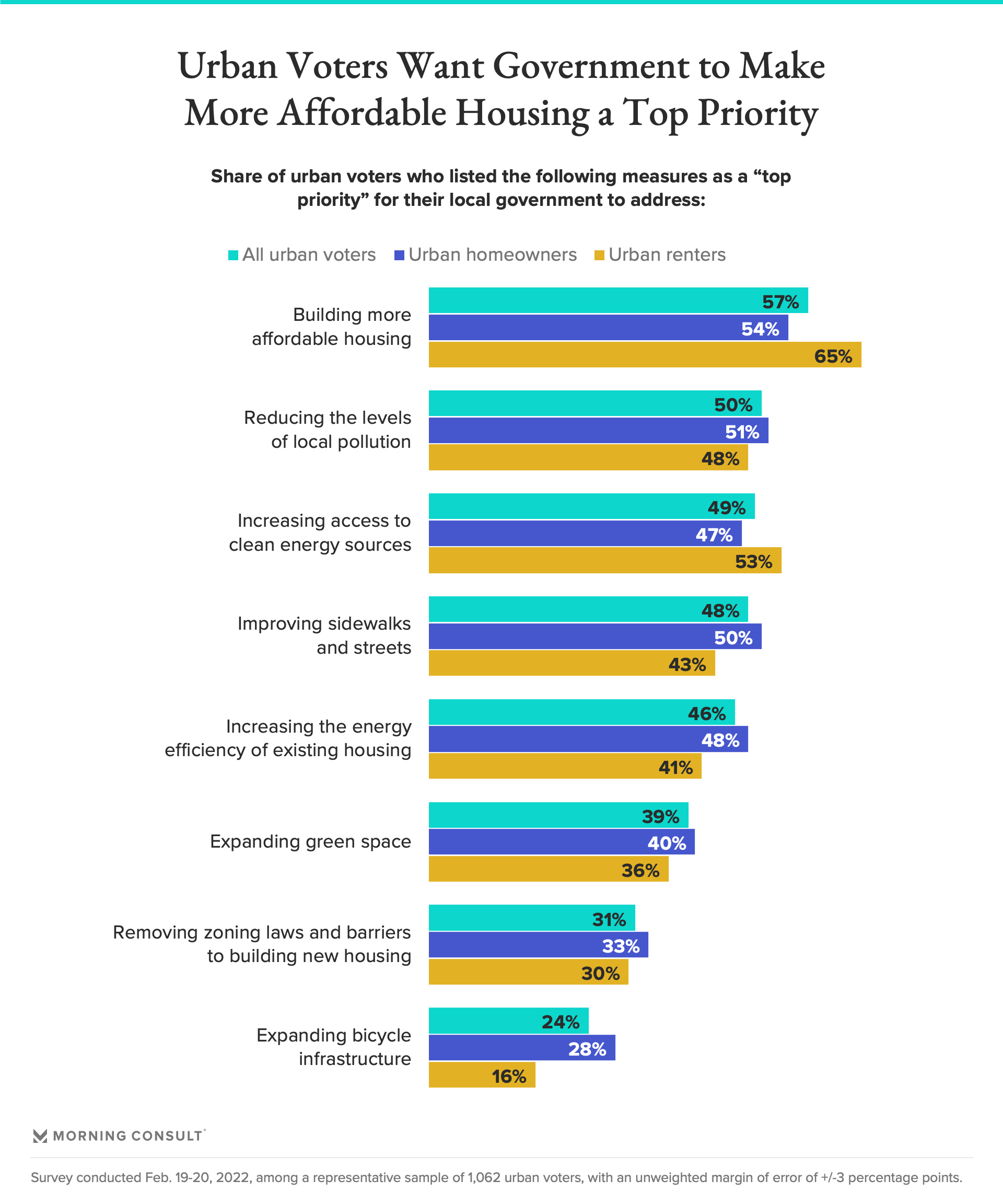 Those goals are of particular interest to voters living in urban areas, 57 percent of whom said in a Morning Consult survey that building more affordable housing should be a “top priority” for their local government to address. Another 28 percent said it should be “an important but lower priority.”