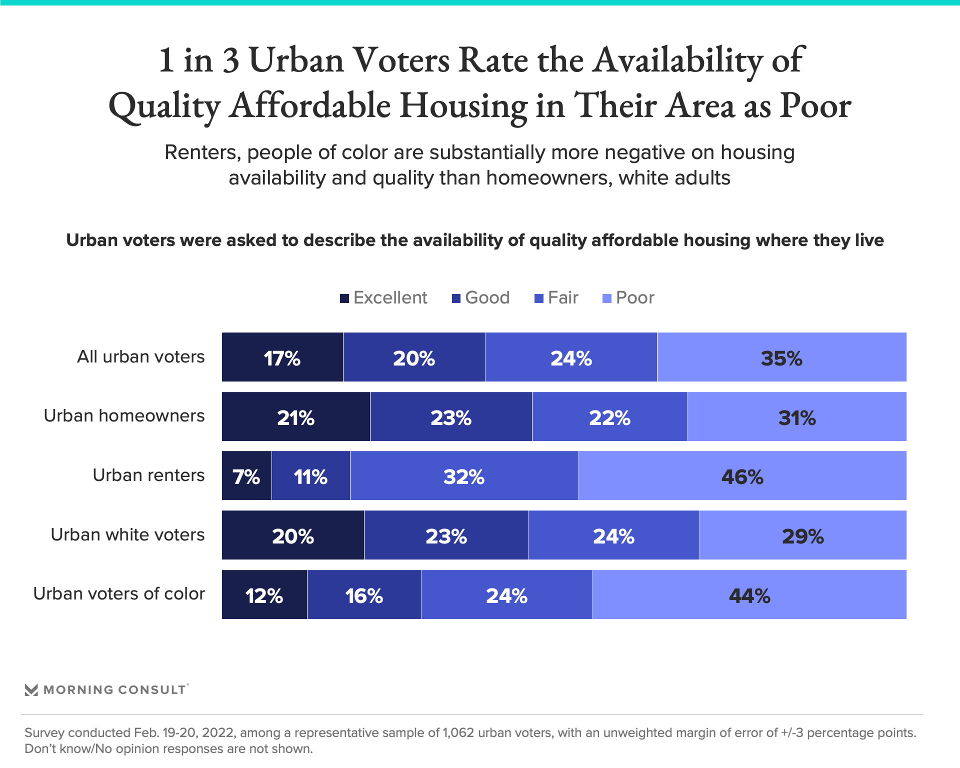 More urban voters than not see lackluster affordable housing stock where they live: 59 percent described the availability of quality affordable housing in their communities as “fair” or “poor,” compared with 37 percent who said it was “excellent” or “good.”