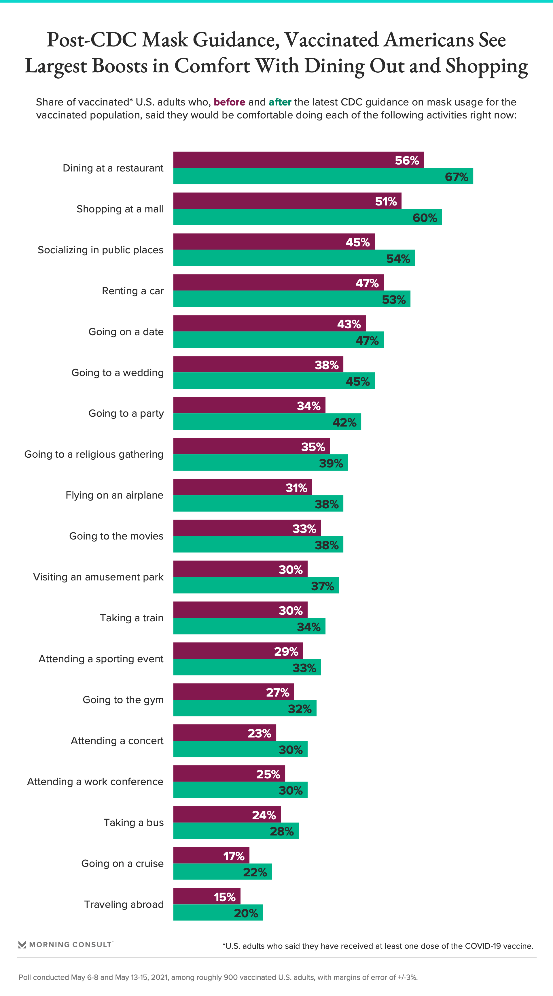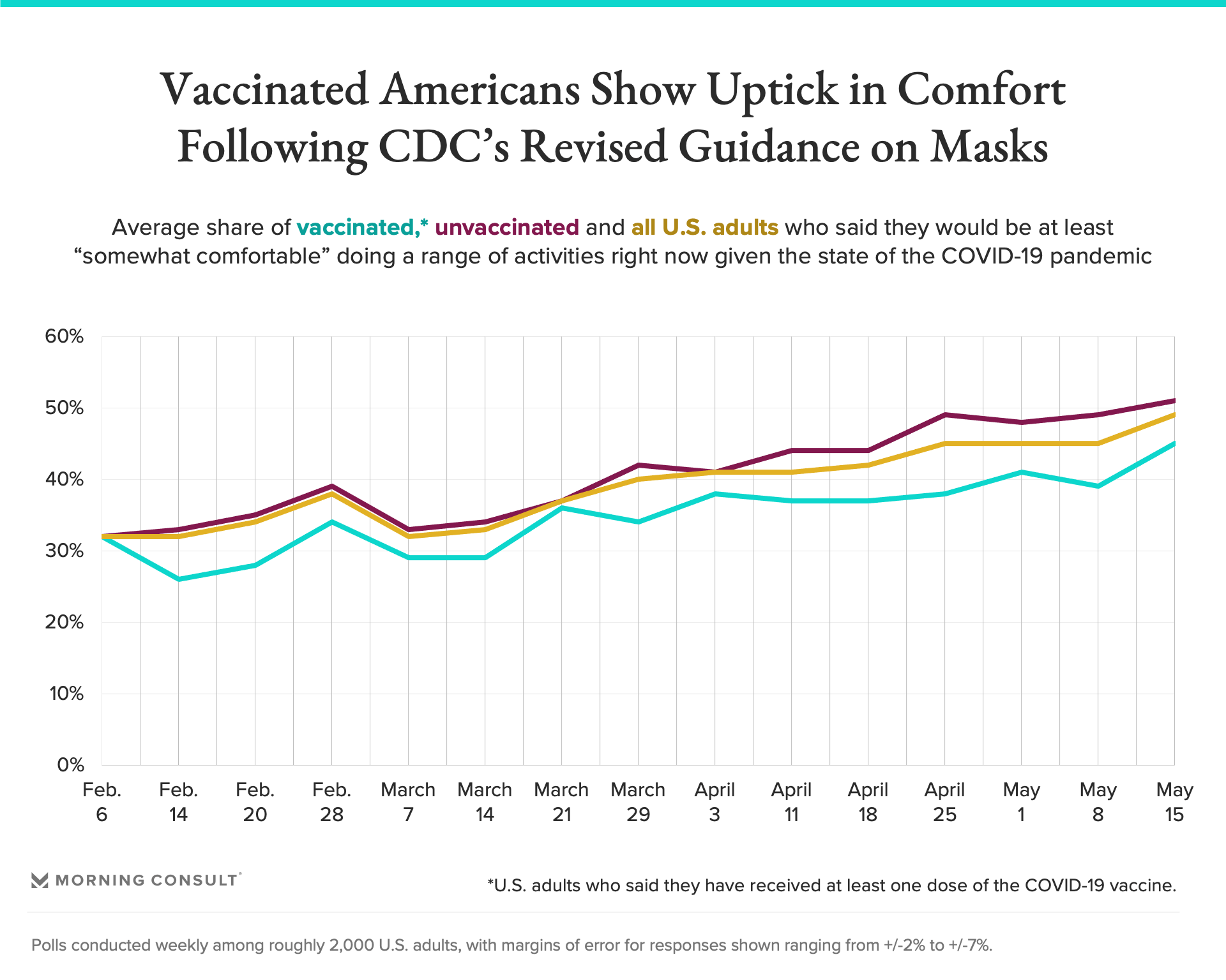 As Morning Consult economist John Leer noted last week, increasing comfort among the vaccinated population will be a key driver in the country’s economic recovery. The latest findings suggest that the new guidance on masking could help businesses pick up the pace.