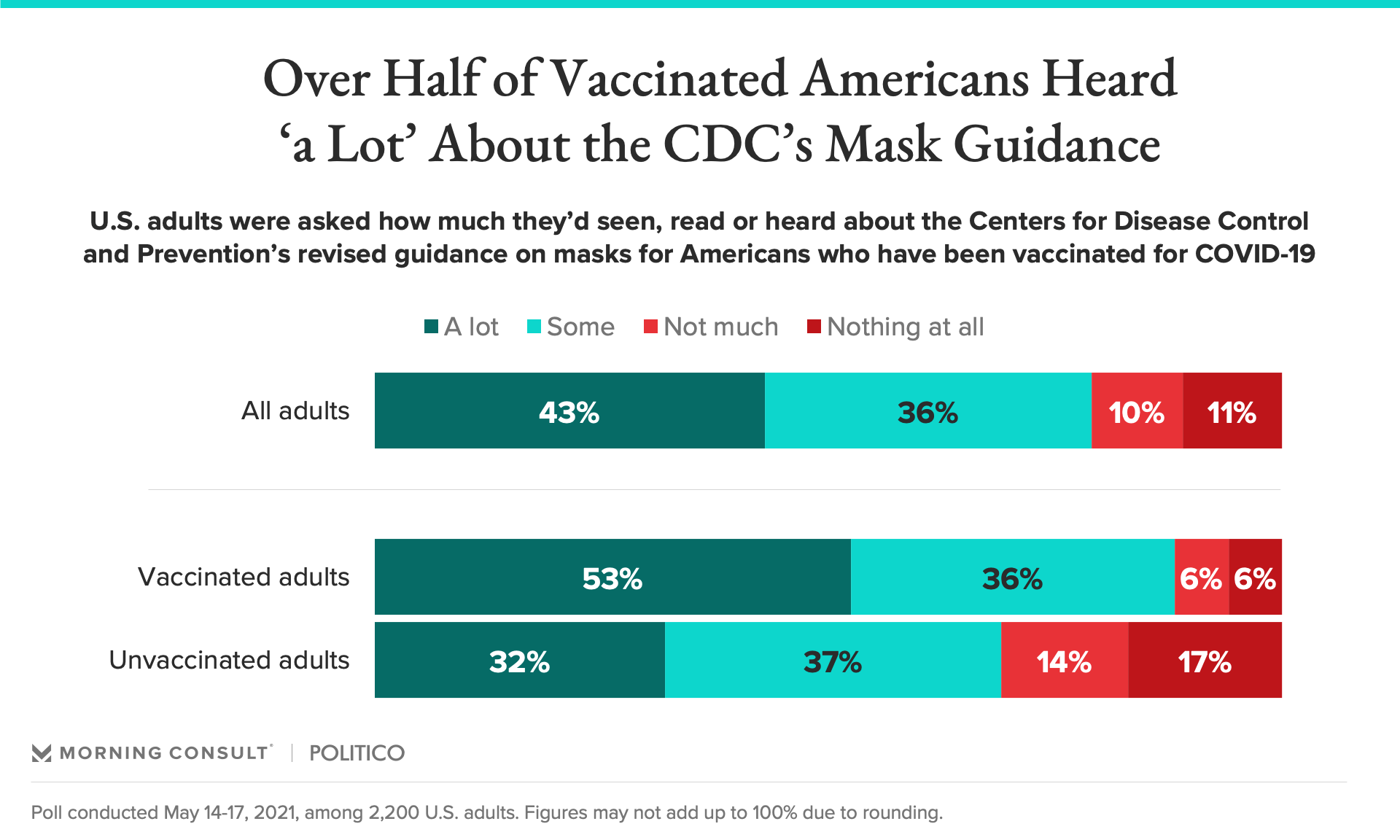 A Morning Consult/Politico poll conducted May 14-17 found that 53 percent of vaccinated U.S. adults said they’d seen, read or heard “a lot” about the decision, compared with 32 percent of unvaccinated respondents who said the same. The survey of 2,200 U.S. adults has a 2-point margin of error.
