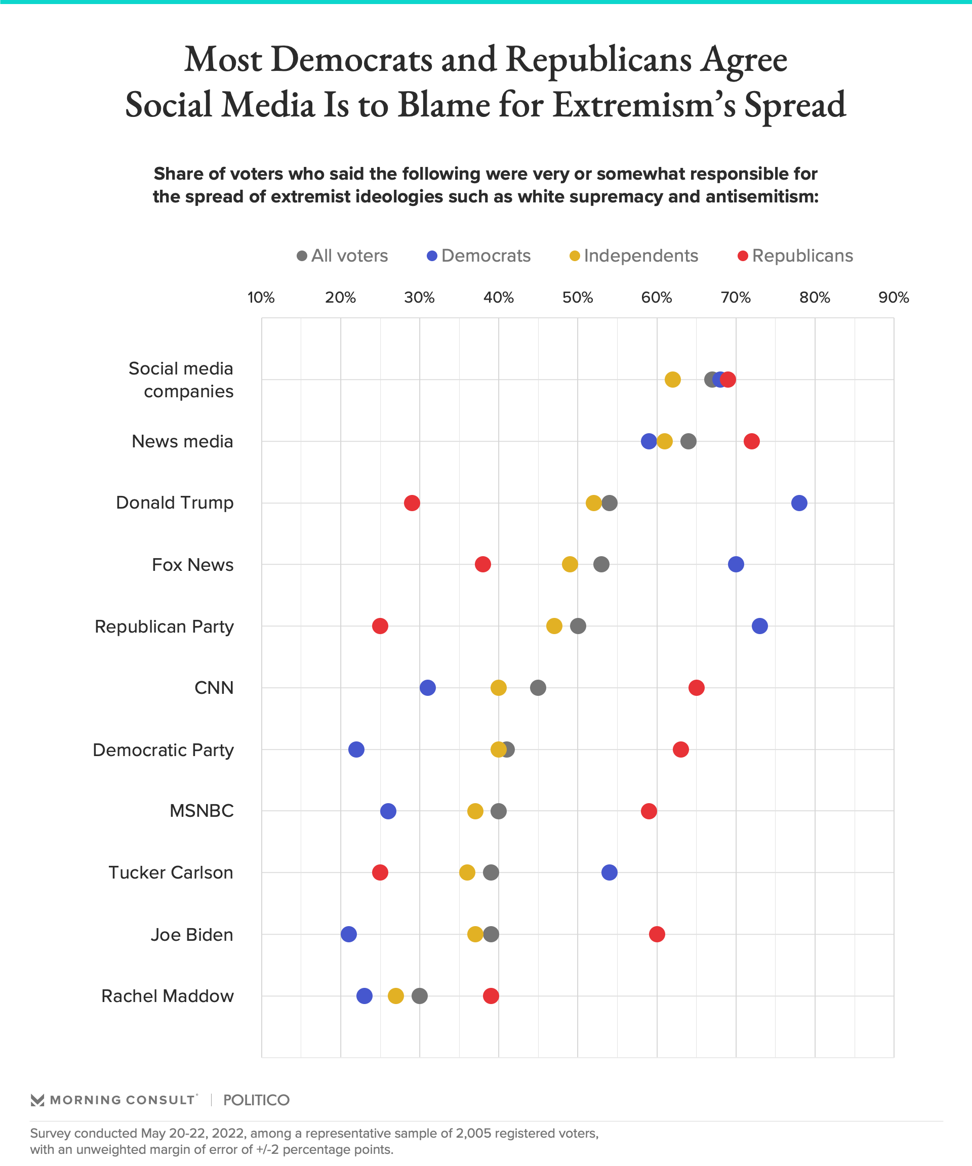 Democrats and even Republicans such as Rep. Liz Cheney of Wyoming blamed the GOP for elevating the racist ideology believed to have motivated the alleged perpetrator of the May 14 mass shooting in Buffalo, N.Y. But more than any political party or cable news platform, a new Morning Consult/Politico survey finds voters hold social media companies and the news media responsible for the spread of extremist ideologies.