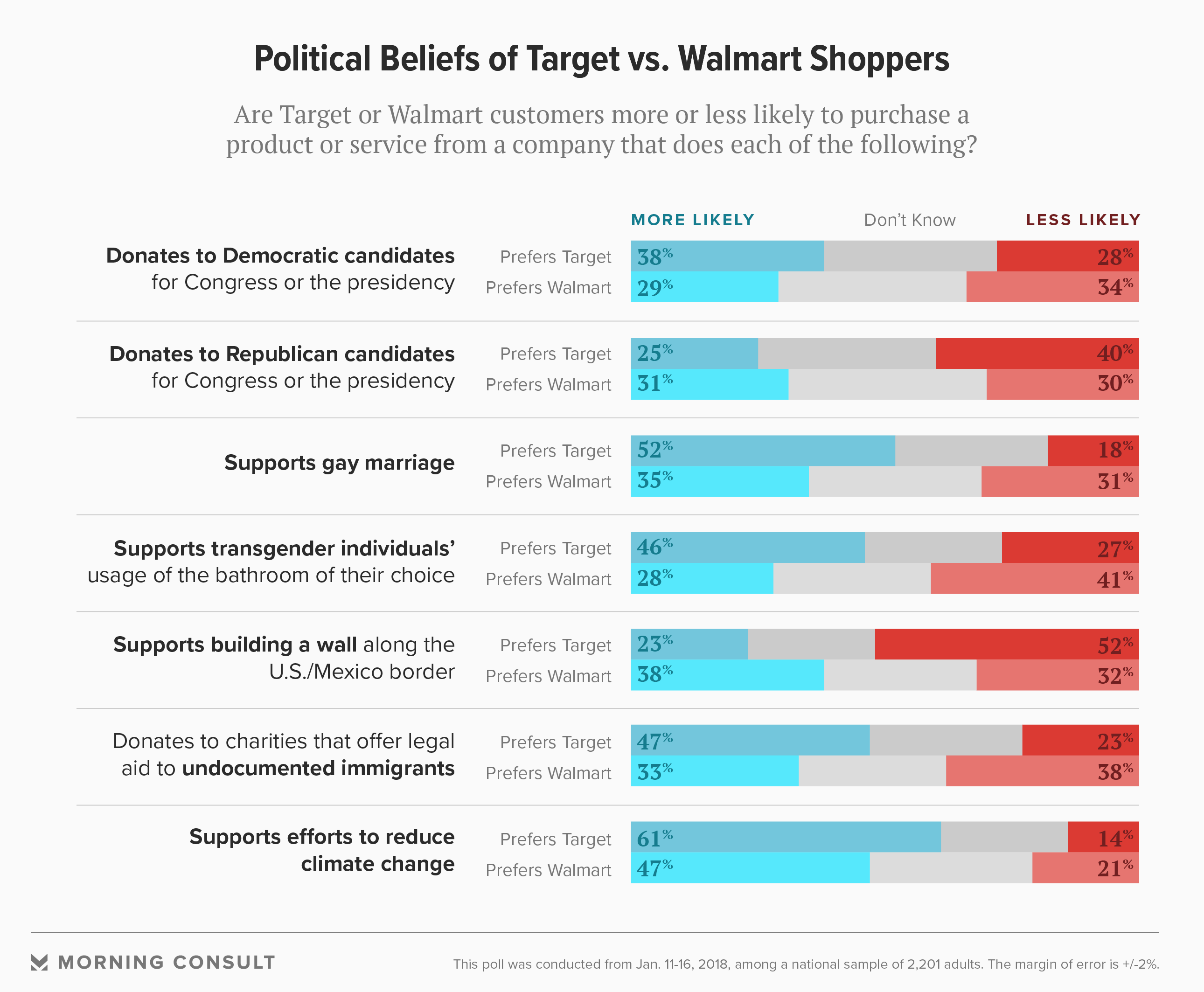 In a separate Morning Consult poll of 2,201 adults, conducted Jan. 11-16, consumers who said they prefer Target were more likely to back progressive political stances, while Walmart customers were less staunch in comparison on conservative positions.