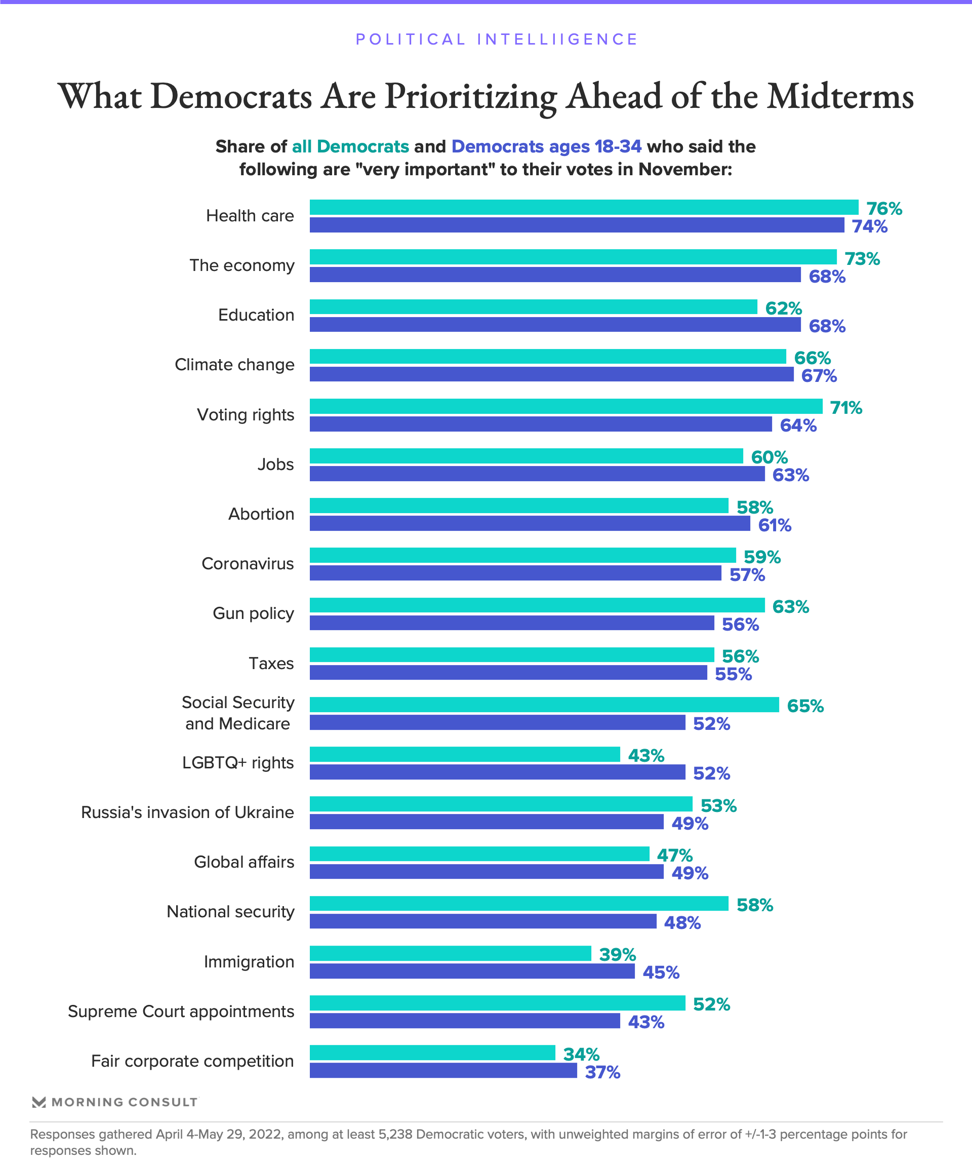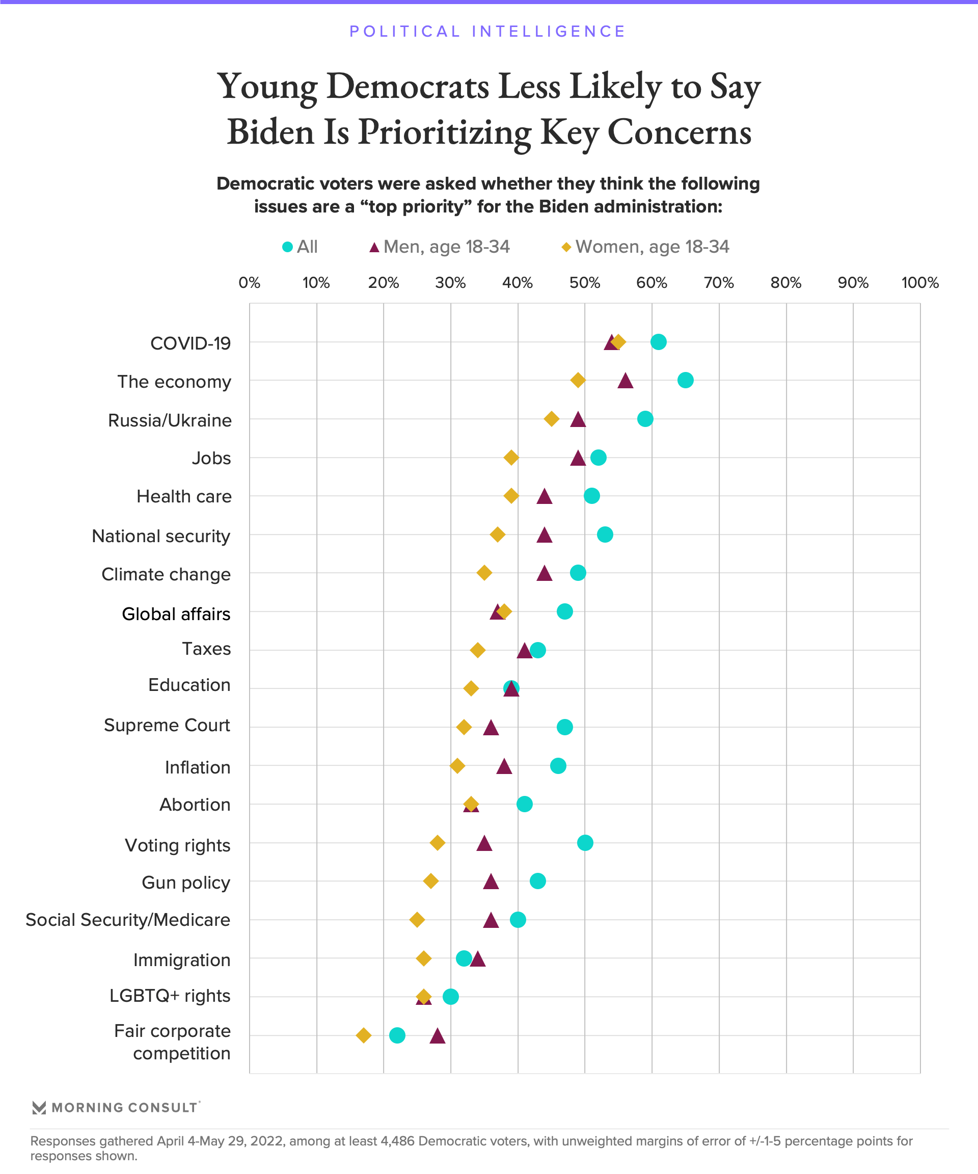 But with just under five months until the midterm elections, it’s this group of voters who present a major challenge for the Democratic Party’s fraught efforts to hold onto Congress this year: Morning Consult Political Intelligence tracking shows Biden’s decline is especially grim among 18- to 34-year-olds. The Democrats among them are less likely than their older peers to see him as prioritizing the country’s biggest problems or holding true to his campaign promises, threatening to stunt base enthusiasm ahead of the consequential campaign season.