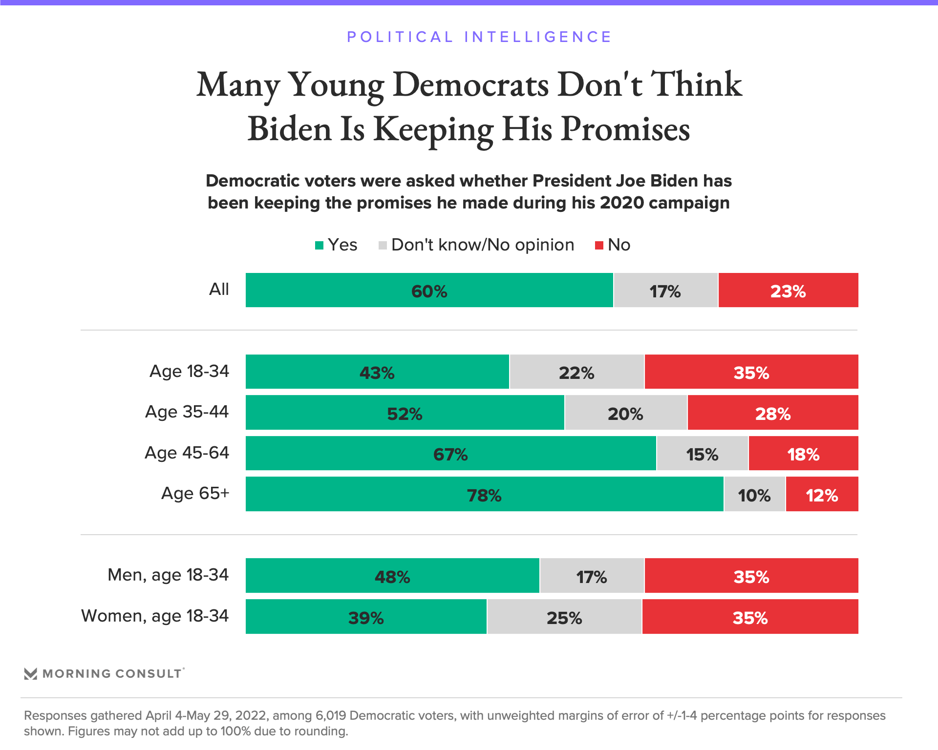 Eighteen- to 34-year-old Democrats are less likely than the party’s average voter (43% to 60%) to agree that Biden has been keeping his promises made in the 2020 election — with young women less likely to agree than young men (39% to 48%).