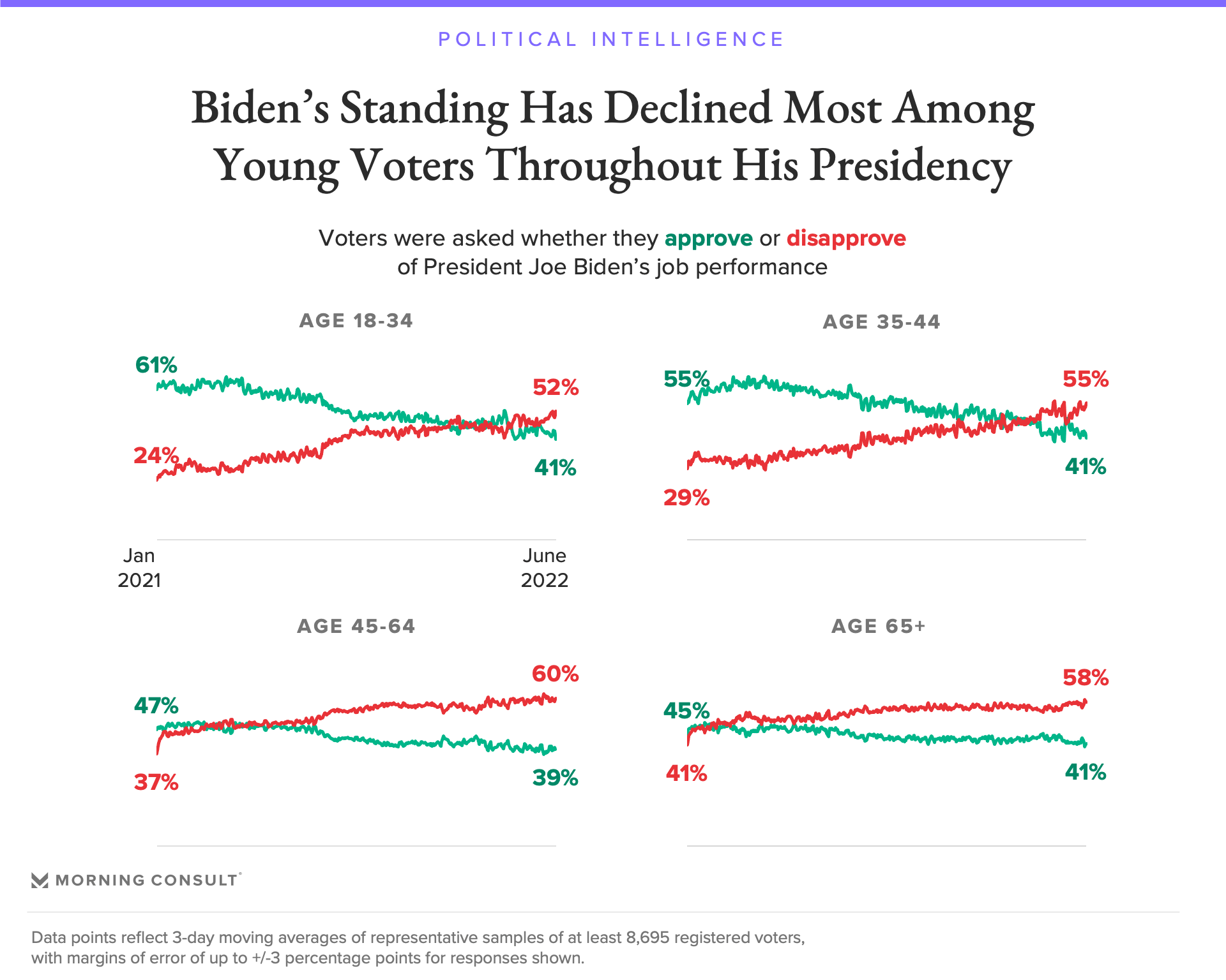 Other Morning Consult surveys conducted in April and May suggest disappointment in the Democratic Party’s younger ranks — both with what Biden has prioritized and what he’s delivered for the American people.