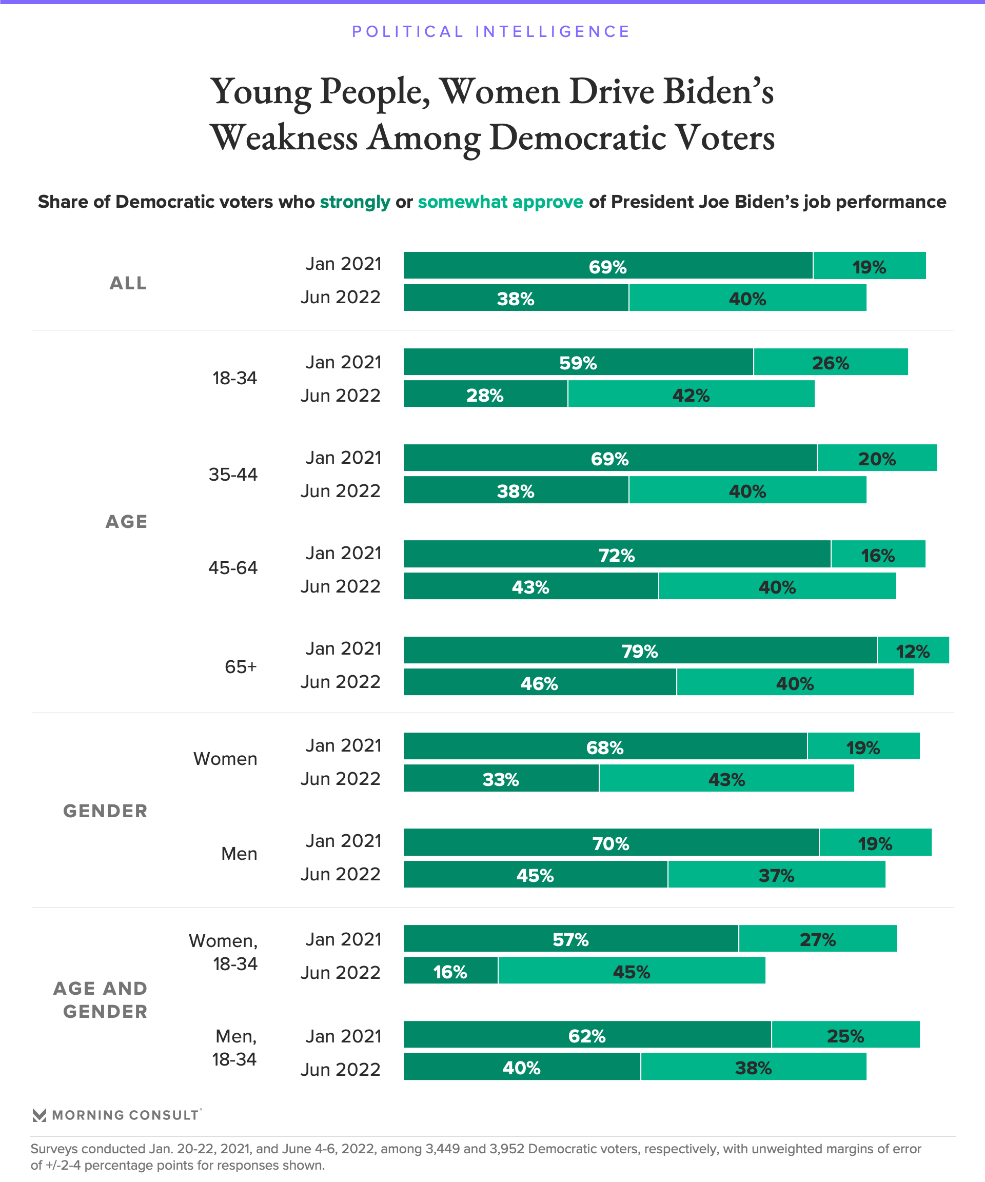 Biden’s decline among Democratic voters ages 18-34 has been driven largely by women: 61% approve of his job performance, compared with 78% of men.