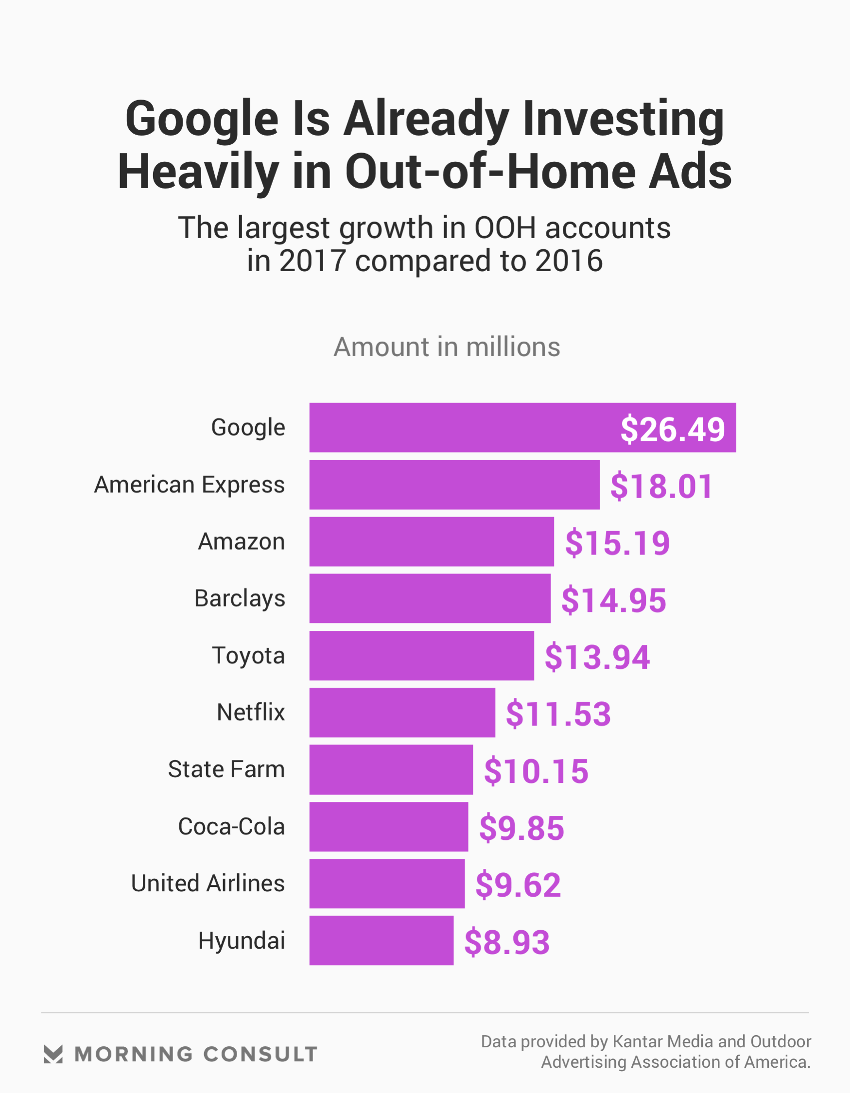 While spending in the out-of-home advertising industry has been growing since 2009, according to an Outdoor Advertising Association of America Inc. report released in May, Google or a similar tech giant could be poised to disrupt a supply chain that billboard operators have dominated. Traditionally, to purchase out-of-home advertisements, agencies representing brands would work directly with the owners of the billboards, like Clear Channel Outdoor Holdings Inc. or Lamar Advertising Co., to help their campaign come to life. (The Outdoor Advertising Association of America declined to comment for this story.)