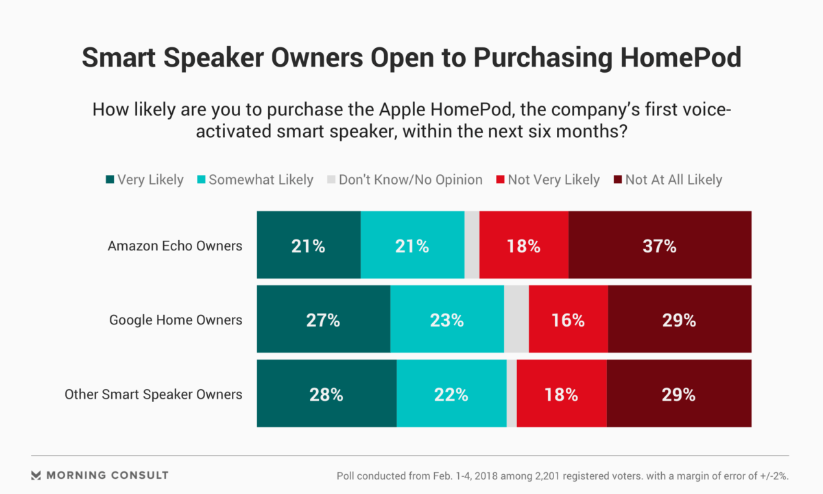 A nationwide survey by Morning Consult, conducted Feb. 1-4 among 2,201 U.S. adults, found that 50 percent of consumers who have Google Home devices said they were likely to purchase the HomePod in the next six months, a sentiment echoed by 42 percent of Amazon Echo owners and 50 percent of people who own other kinds of smart speakers. The poll has a margin of error of plus or minus 2 percentage points.